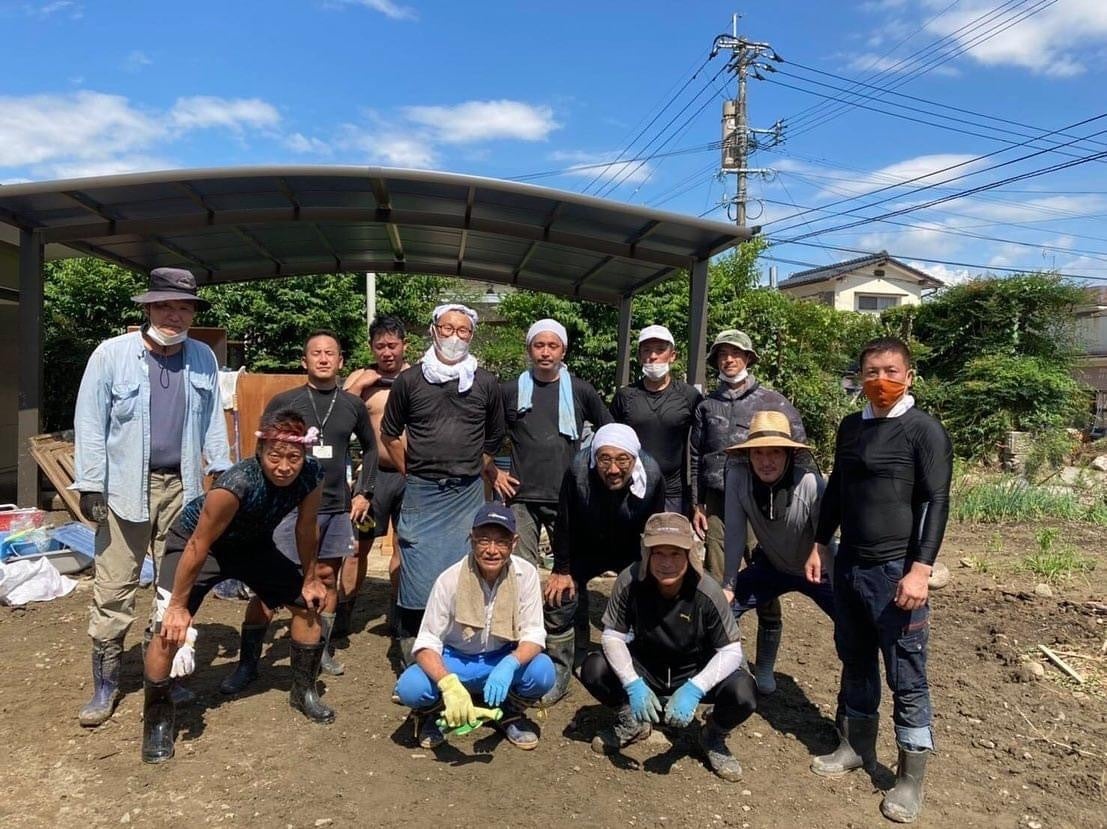 ↑父の剣道の先輩宅(人吉市内)の片付けに、ボンジャスメンバーと父(前方右)。