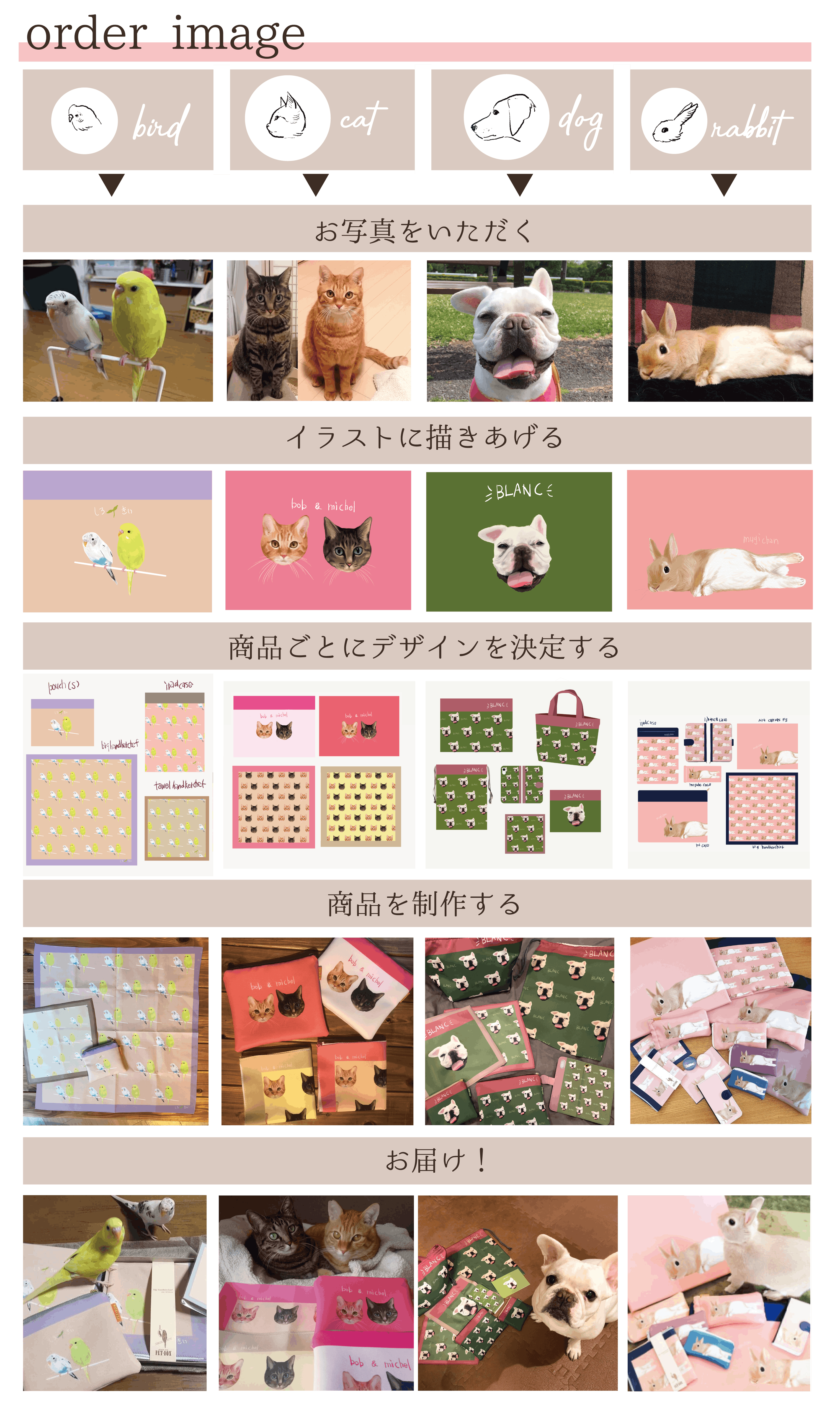 このオーダーサービスをもっと多くの人に知ってもらい利用していただきたく『多くの人に知ってもらいたい!』という気持ちと、現在オーダーサービスはメールで受付のため、もっとわかりやすくご利用いただける様に『専用サイト制作の資金調達』を合わせて今回の目標とし、正式に "うちの子”をデザインしたアイテムを制作するオーダーメイドブランドを立ち上げる事にしました。