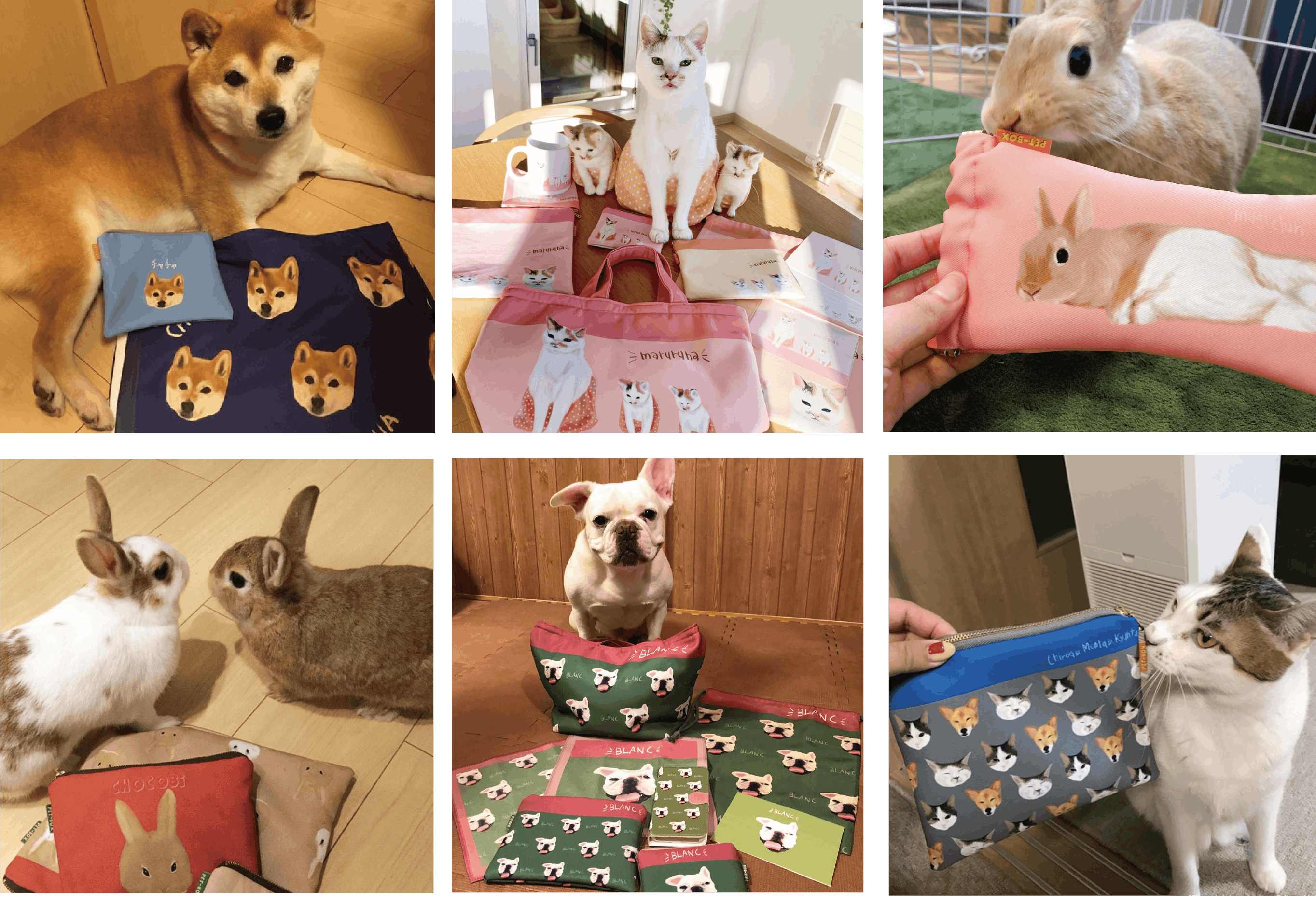 お客様と接する中で、皆様のかけがえのない”うちの子”をイラストに描きおこし、世界に1つだけのアイテムにできたら、もっと喜んでもらえるのではないだろうか?と思い、店舗とSNSで1年程オーダー受注を行い、色んな”うちの子”グッズを作らせていただきました。
