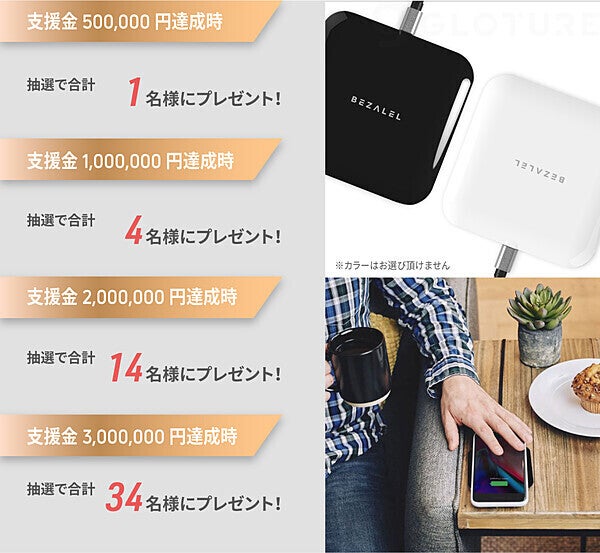 ・支援金3,000,000円達成で、ワイヤレスチャージャー「FuturaX」をさらに20名様(合計34名様)にプレゼント!