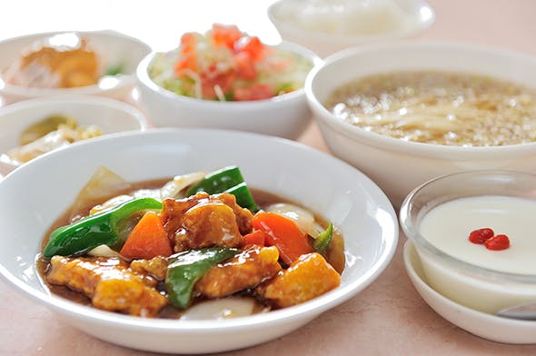酢豚、ミニラーメン、小皿料理、サラダ、ザーサイ、ライス、杏仁豆腐のセットです。