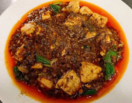 100%植物油で作った自家製辣油、山椒油、葱油、香油とオリジナルブレンド豆板醤、四川省の山椒、葉にんにくを使い、四川省の麻婆豆腐をイメージした香豊かな麻(しびれる)辣(辛い)が効いた一品に仕上げております。