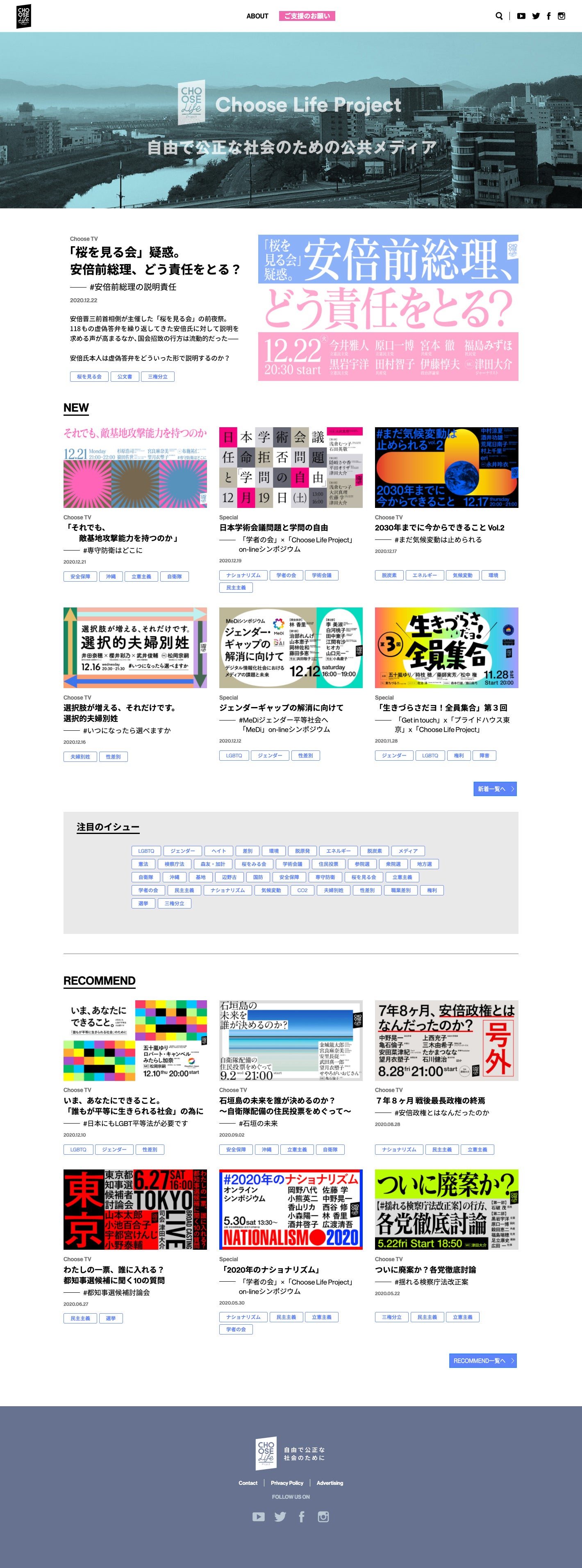 「Choose Life Project」は、テレビの報道番組や映画、ドキュメンタリーを制作している有志で始めた団体です。これまで、理念を共有するデザイナー、また著名人や文化人の方々の協力を得て、国政選挙などに合わせた「投票呼びかけ動画」、国会”解説”動画、裁判に関する記録、時事問題に関する生討論番組、オンラインシンポジウムなどを、不定期で配信してきました。