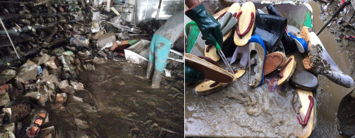 2020年7月4日、九州の豪雨による洪水で、熊本県人吉市九日町の創業97年の老舗『つぼや履物店』が二階まで浸水し、壊滅的な状況となりました。