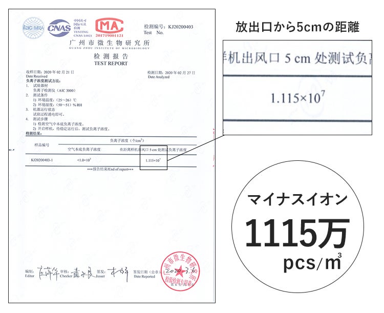 こちらは、空間中のマイナスイオン濃度を測定した、実際の試験結果データです。「CRISP」のマイナスイオン放出口から5cmの距離で測定した結果、1115万pcs/㎥ものマイナスイオンが計測されました。