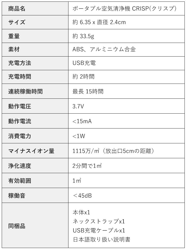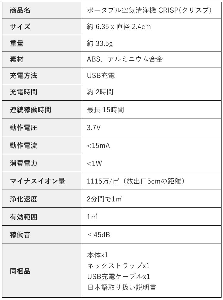 1115万pcs/㎥のマイナスイオンを作り出す、ポータブル空気清浄機「CRISP(クリスプ)」。不快な煙草の煙、PM2.5、花粉…空気中の様々な有害物質を効果的にブロックします。