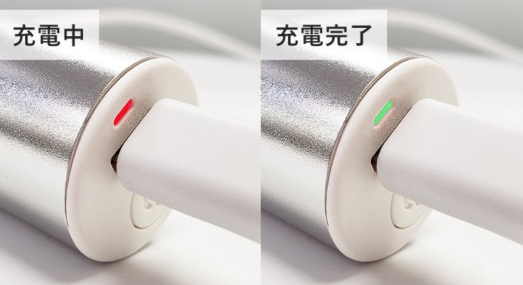 充電中は赤ライトが点灯、充電が完了すると、緑ライトが点灯するので、充電の状態も一目瞭然です。