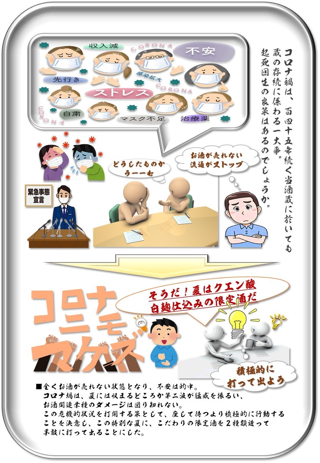 東京オリンピックが延期され、コロナ堝でお盆の帰省もままならない異常事態が続いている2020年の残夏ですが、少しでも皆さまの活力に繋がるように、また皆さまの「マイお酒ライフ」の1ページに華を添えられるような酒造りに精進致します。
