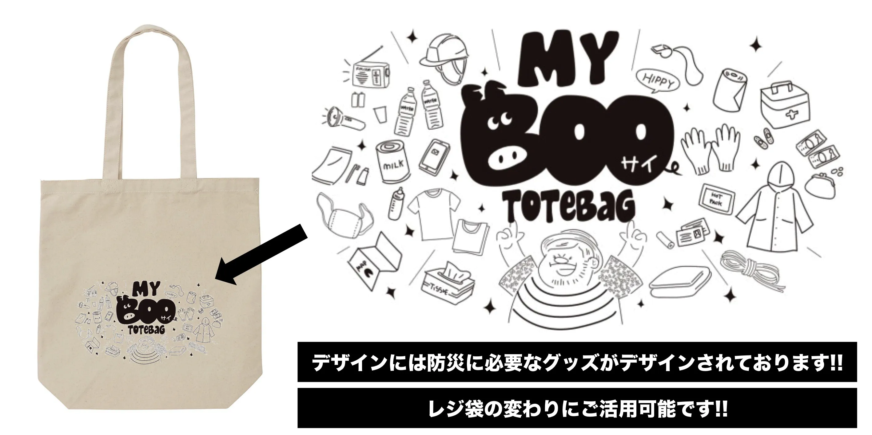 デザインに防災道具が記載されており、防災バッグとしても活用可能!!