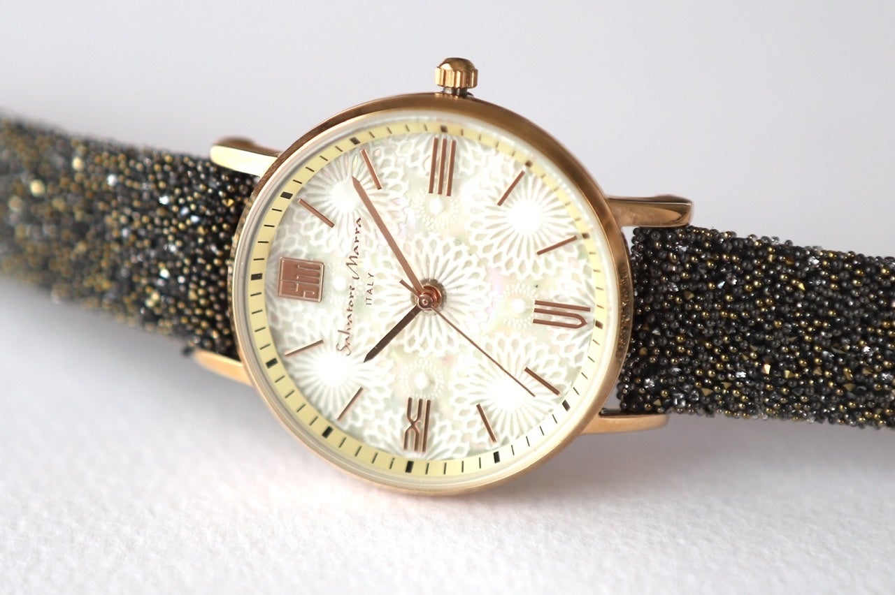天然貝のキラキラと輝く文字盤に、スワロフスキー®クリスタルのベルト。 今までの腕時計にはない、ラグジュアリーな体験をしていただけます。