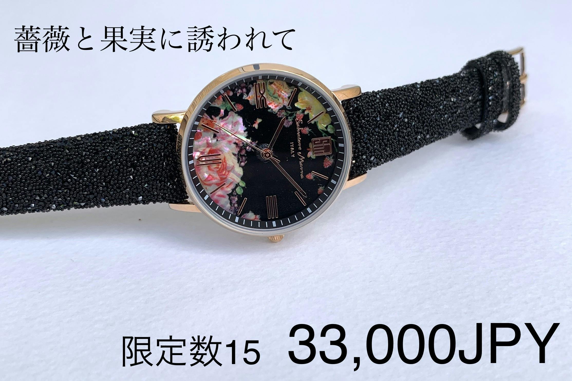 この螺鈿アート「薔薇と果実に誘われて」を文字盤に採用した腕時計をリターンに追加登録させて頂きました。