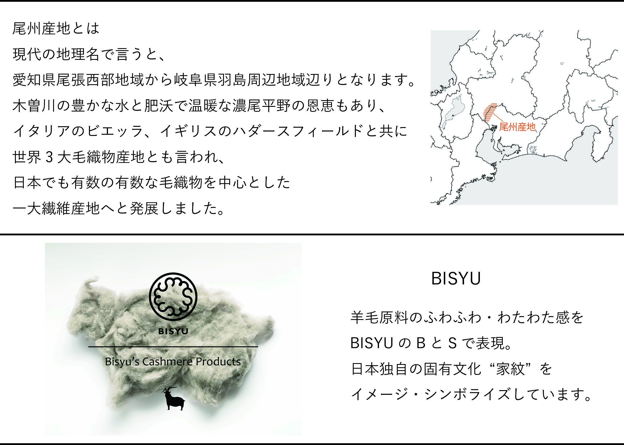 Bisyu’s - Products.は地元『尾州産地』にて、たくさんの職人さんたちに囲まれた素晴らしい環境の中、原料、糸の選別から素材・生産地にこだわりものづくりをしております。