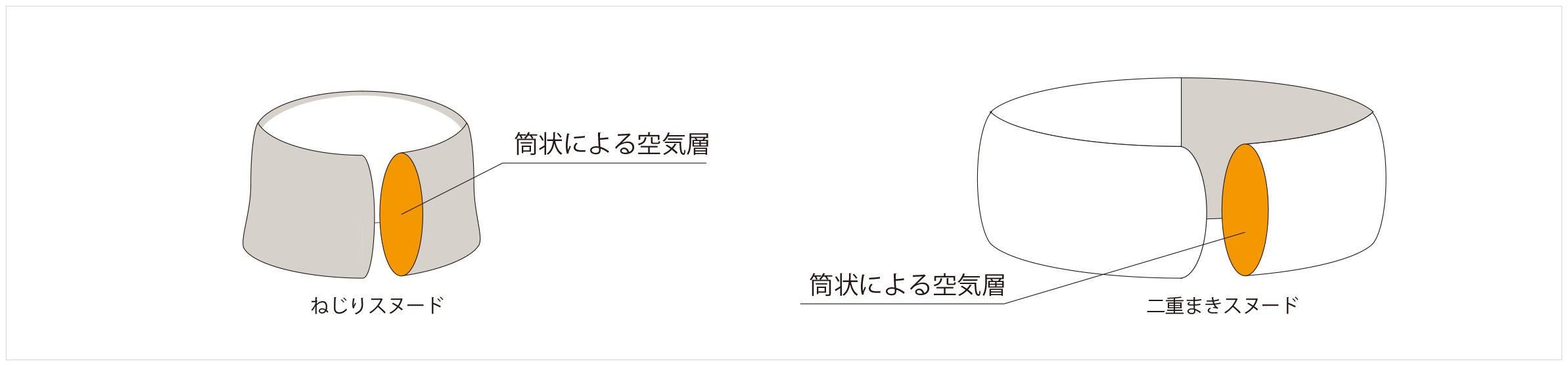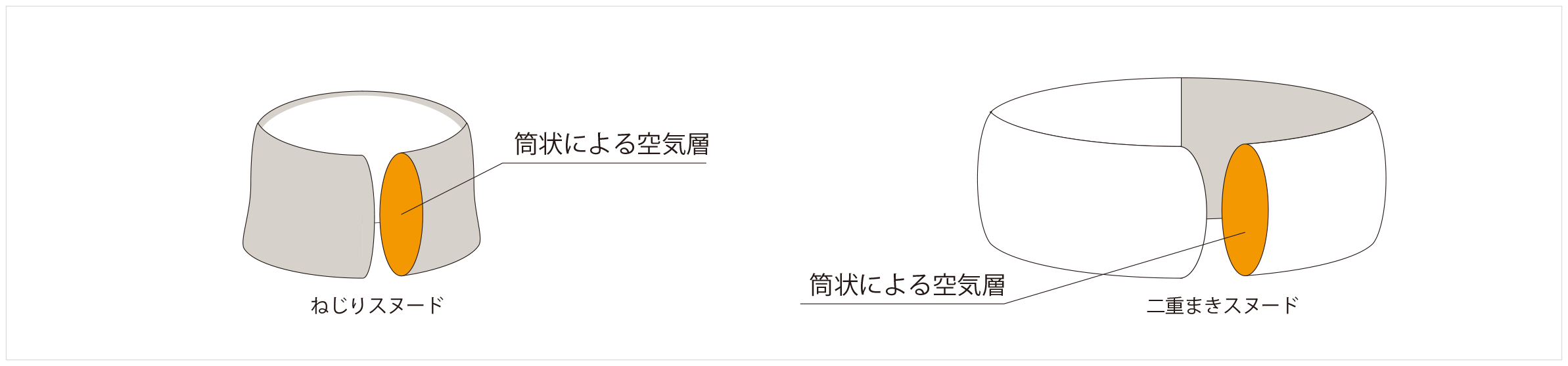 浮き輪型のデザインは空気の層を作ってくれ、すっぽり、捻りながら二重に巻けば、