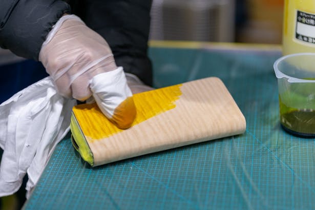 2日目〜5日目も同様のカラーリング加工と乾燥を要し翌日の研磨加工ではサンドペーパーの番手を日毎に240番400番600番と徐々に細かくしていき仕上げの1000番で鏡面のような艶感となめらかさを作り上げます。