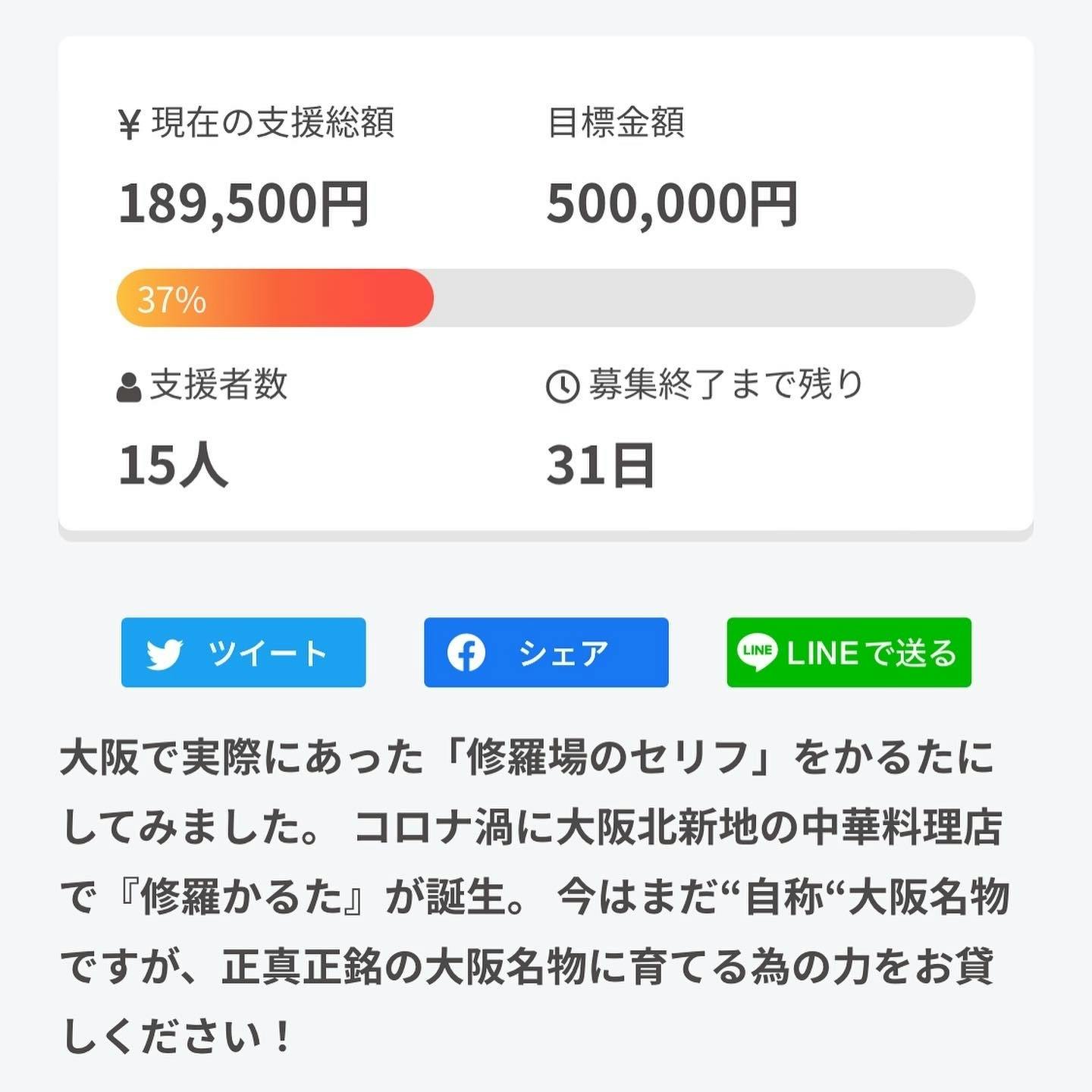 2022/03/01 09:08支援していただいたみなさまSNSでいいねや拡散をしていただいたみなさま本当に本当にありがとうございます!!!そして、みなさまから意見を参考にし、リターンの種類を増やし・麻婆豆腐の素6パックとかるた1箱(¥10,000)・北新地RAKUSUIで使えるお食事券2万円分(¥18,000)を追加しようと考えております。反映までにあと5日ほどかかるかと思いますので支援を検討されている方はぜひ参考にしていただければと思います。引き続きよろしくお願いいたします。 もっと見る