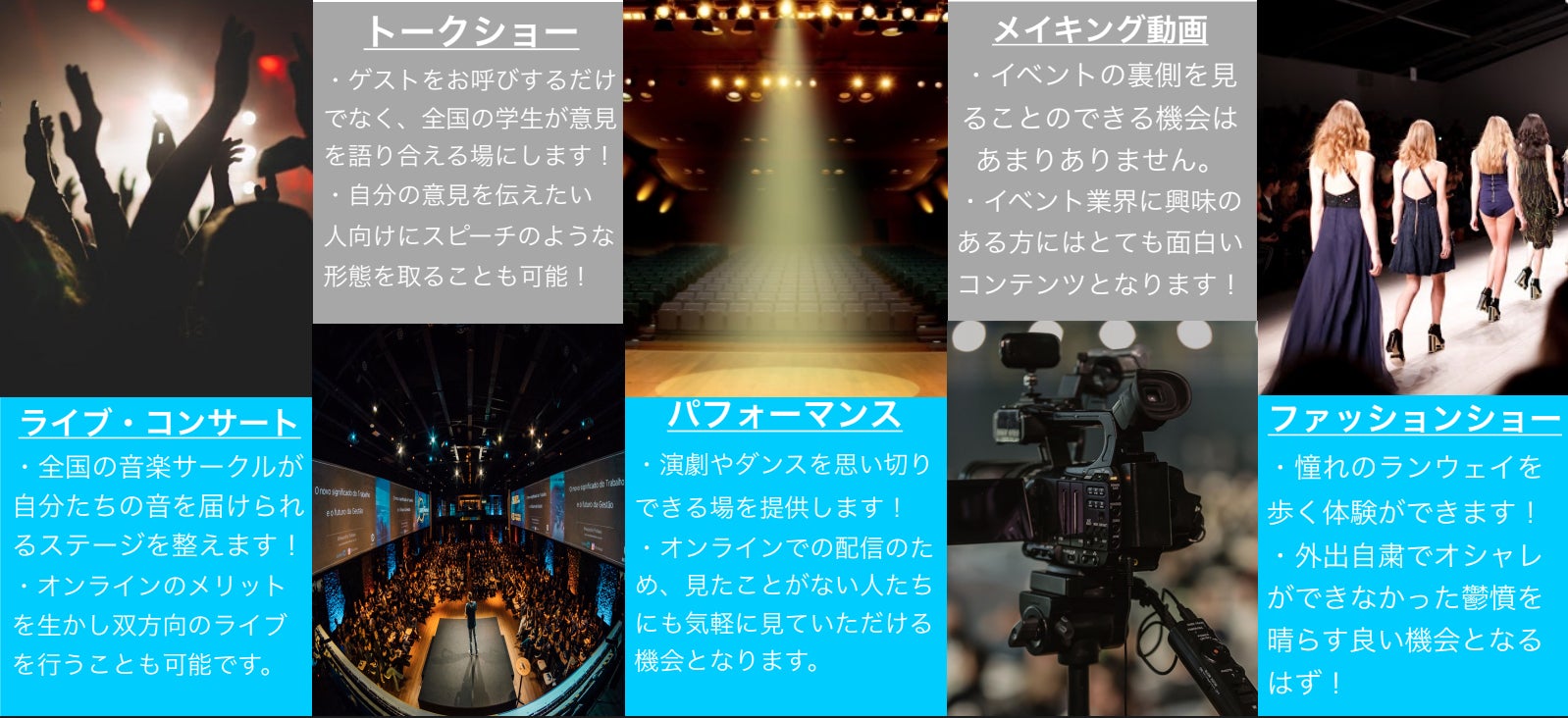 ■ライブ配信・・・場所に囚われず、誰もが参加できるオンラインのメリットを生かして、視聴者参加型のライブ配信をリアルイベントと並行して実施。遠方のためリアルイベントに出場できない団体でも、動画等を提供いただければ、開催期間中に配信が可能。様々な形のバラエティに富んだオンライン学園祭を目指します。