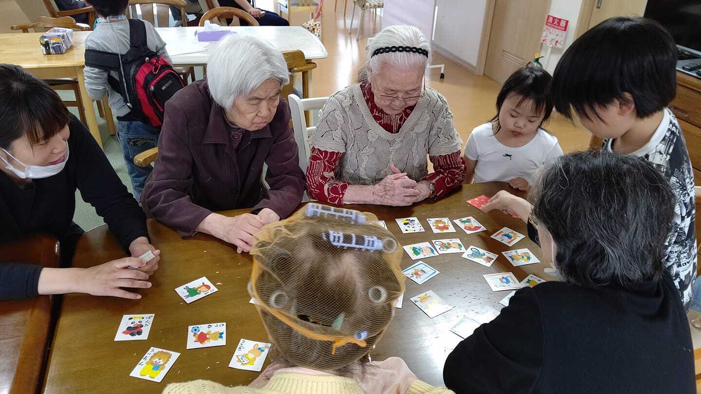 私たちの共生型デイサービスは、高齢者のデイサービスと小学生から高校生までの障がいのある児童が通う放課後等デイサービスを、同じ建物の中で行い、お年寄りと児童が一緒の空間で、交流を持ちながら過ごしています。