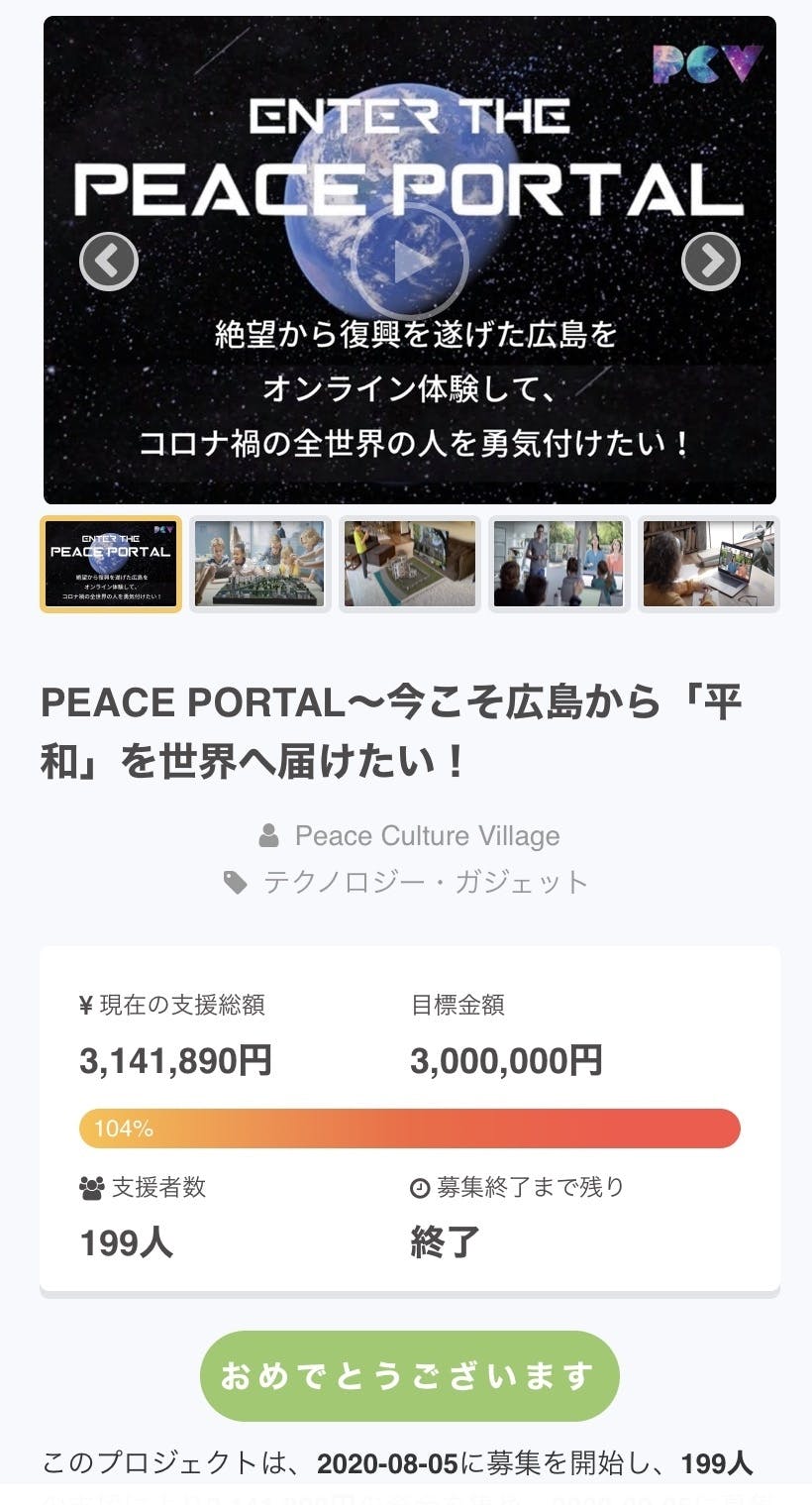 2020/09/04 23:38本日、目標を達成することが出来ました。ご支援頂き心からありがとうございます。感無量で感謝感謝です。クラファンが終了しますが、これからがスタート!!皆様の期待に応えられるようPEACE PORTALを形にしていきます!これからもPCVをよろしくお願いします! もっと見る