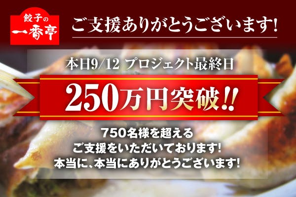 2020/09/12 14:51皆様こんにちは!あっという間のプロジェクト期間、最終日を迎えました。皆様のご支援をいただき、最終日ただいまの段階で750名様、250万円超えのご支援をいただいております!初めてのクラウドファンディングチャレンジ、これほどまでにご支援をいただけていることただただ皆様に感謝でございます!実店舗のファンでいてくださるお客様、初めて一番亭のことを知ったお客様、餃子が好き、らーめんが好き、様々な方にかけがえのないご支援をいただいております。プロジェクト終了まで残り数時間となりますが、皆様の応援、ご支援を糧にがんばっていきます!(株)にしはらグループ もっと見る
