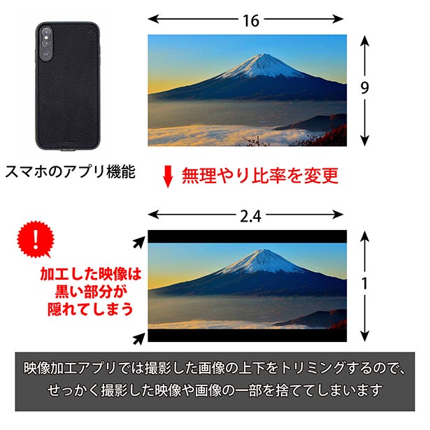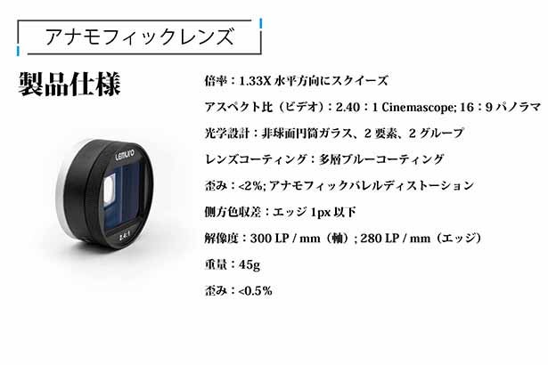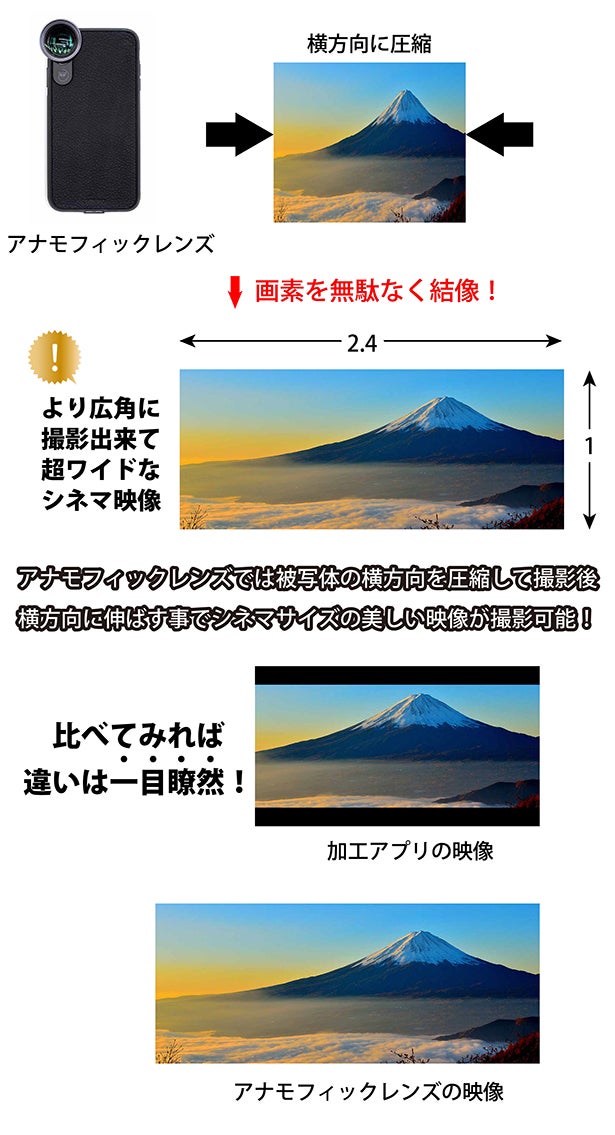 スマホのカメラに取付けるだけで2.4:1のシネマサイズのプロ仕様の動画や画像が簡単に撮影できます。
