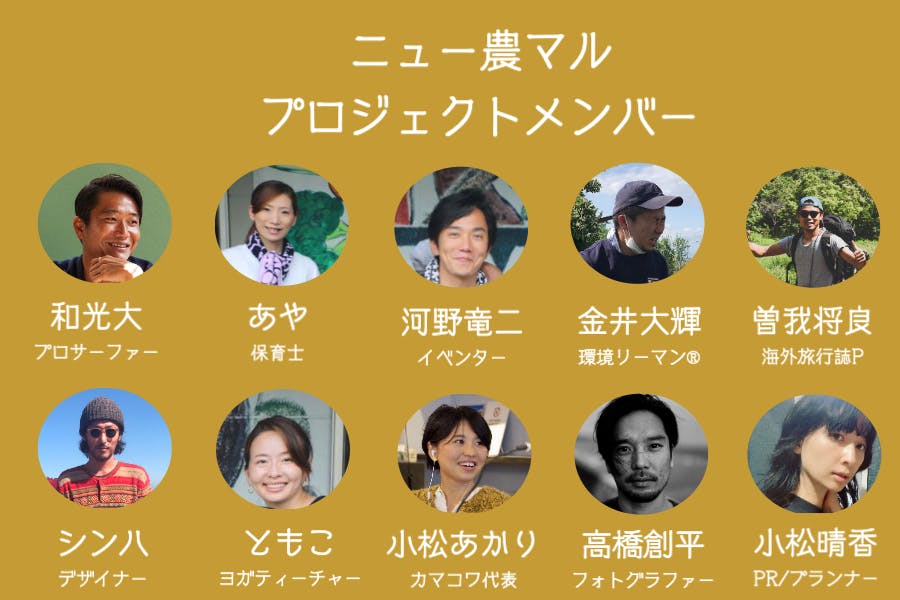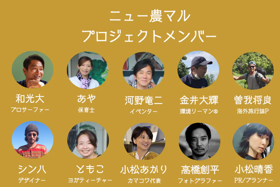 ニュー農マルプロジェクトは、プロサーファー、デザイナー、イベントオーガナイザー、主婦、障害者、農家、サラリーマンなど多彩なメンバーで構成されています。地元鎌倉、そして湘南エリアを食・農を通じて盛り上げていきたいという共通の想いで集った素敵な仲間たちです。定期的に開催するイベントやニュー農マル正規会員の中で、皆さまとの出会いを心待ちにしています。