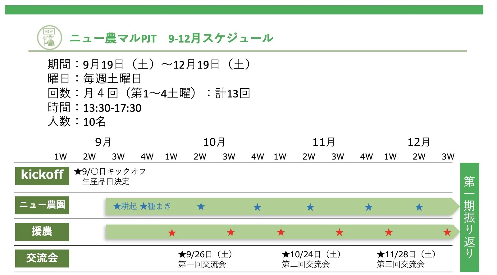 以上、①②③を通じて、「地域の人が農業に主体的に関わっていく仕組み」を作りあげ、新鮮で安心な食で溢れる町をみんなで作る活動を継続的に実践します。また、参加者同士での交流も多く持つことができ、新しいコミュニティ「ニュー農マルプロジェクト」でのたくさんの「出会い」の機会があります。