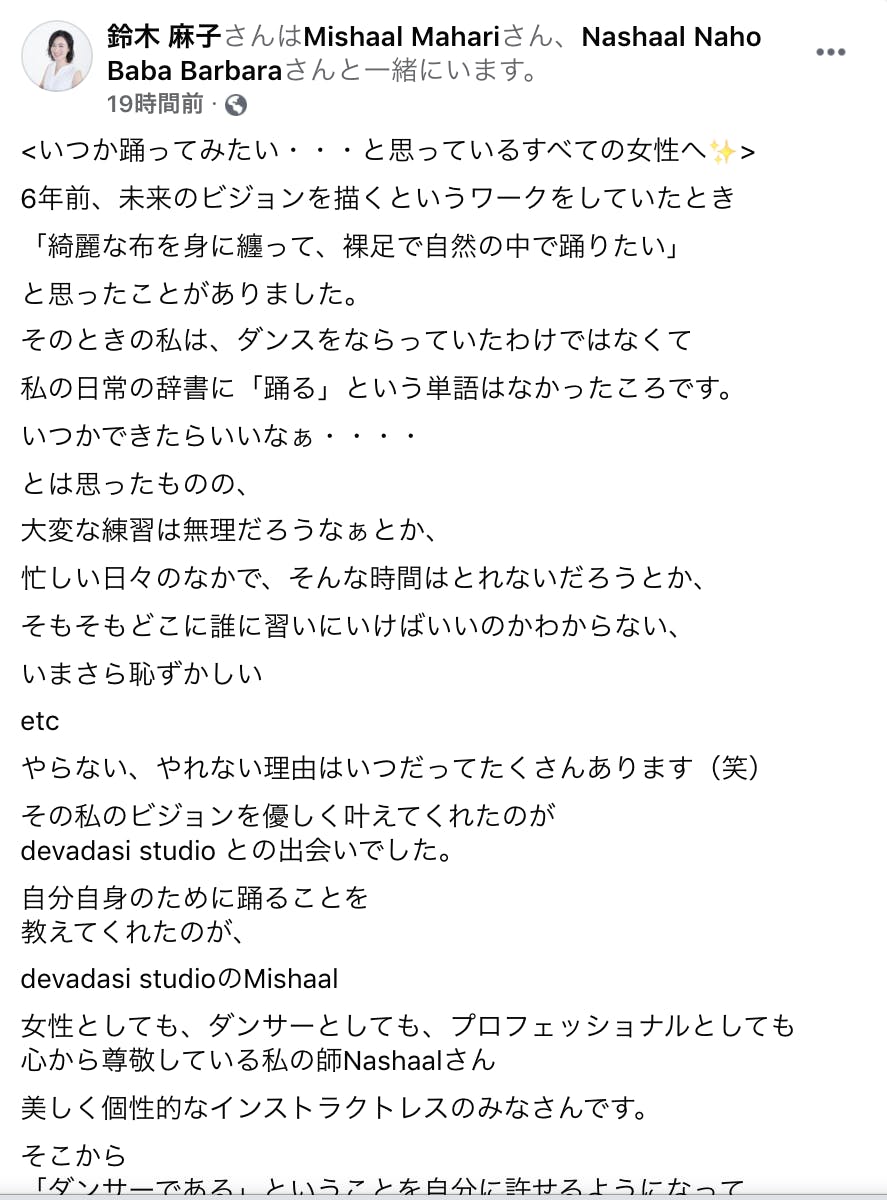 デバダシスタジオは、ダンスと女性たちを導くための並外れた本質的な価値観と、献身的な講師や参加メンバーにあふれたスタジオです。私が東京に通ってきたこの10年、とても力強い、女性たちのコミュニティーの中心であり続けています。スタジオを創り育て続けている主宰のミシャール、そして一人ひとりの生徒さん、講師のみなさんを心からの敬意を送ります。またここに戻れることを楽しみにしています。