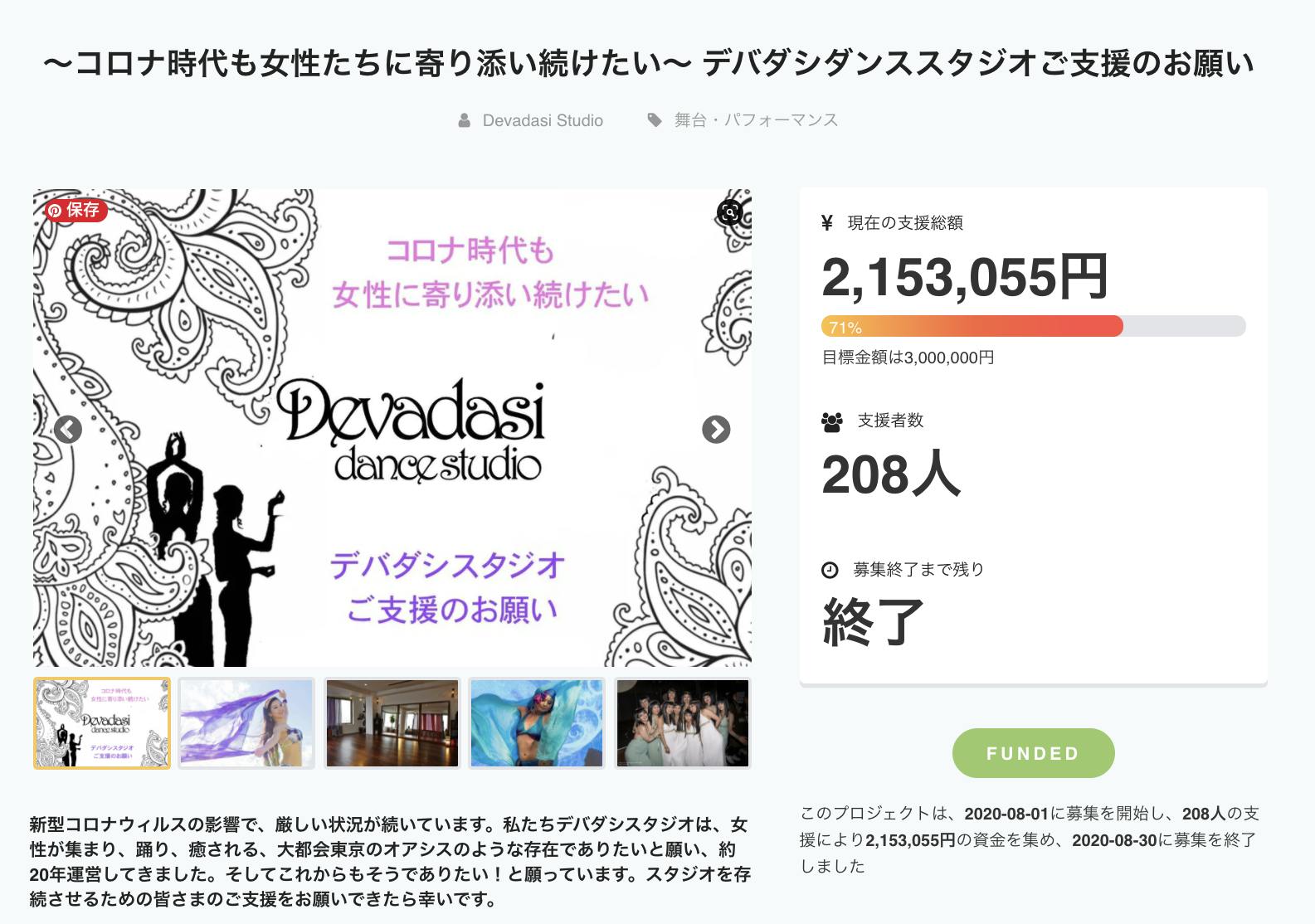 2020/08/31 02:25おかげさまで、クラウドファンディングが無事に終了いたしました。さきほど、デバダシスタジオ公式facebook に投稿いたしましたスタジオ主宰ミシャールからのメッセージを、こちらにご報告させていただきます。=====親愛なる友人のみなさんへおかげさまでクラウドファンディングが幕を下ろしいました。合計 2,153,055円 のご支援をいただきました。今回は、CAMPFIRE社のコロナウィルス・サポートプログラムでの実施のため、手数料は0円で、すべてスタジオへの支援金として、使わせていただきます。208人もの、寛容にして広い心のみなさんお一人おひとりに、心から感謝申し上げます。みなさんお一人おひとりが、2020年のデバダシスタジオを継続・存続するための、大きな力となってくださいました。きっと、みなさま誰しもにとって、今年はとても不確定な、大変な1年だと思います。そんな中、みなさんのご支援はとても光栄なものであり、ご支援いただいて祝福されている気持ちでいっぱいです。わたしは、疲れを知らない尽力でこのクラウドファンディングを実現してくれたNashaalにも、大きな感謝を叫びたいと思います! そして、このクラウドファンディングは、CAMPFIRE社のすばらしいサポートなしには、実現できませんでした。そして、デバダシスタジオのインストラクトレス(講師)たちーを長らく支えてくれている Yaliel, Yukta, たゆまぬ努力でスタジオを共にとなってくれているMadhurima, Mediha, Mehtap, アシスタントとしも支えの柱の一人となってくれているYung、共にスタジオを支えてくれるGoRo Miyamotoに、心からの感謝を伝えたいと思います。そして、すべてのデバダシのチーム、デバダシのスタジオのメンバーのみなさん、いまは離れても想い続けてくれるみなさんに、感謝申し上げます。 デバダシスタジオの魔法に参加してくださり、ありがとうございまました!みなさんに、近い内にお目にかかれますように!心をこめてミシャール もっと見る