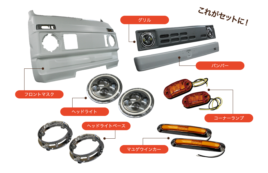 製品は、フロント周囲のフロントマスクとグリル、バンパー、ヘッドライト、ヘッドライトを固定するベース、マユゲウインカー、コーナーランプがセットになります。これらを、純正パーツを外して交換装着する仕組みです。