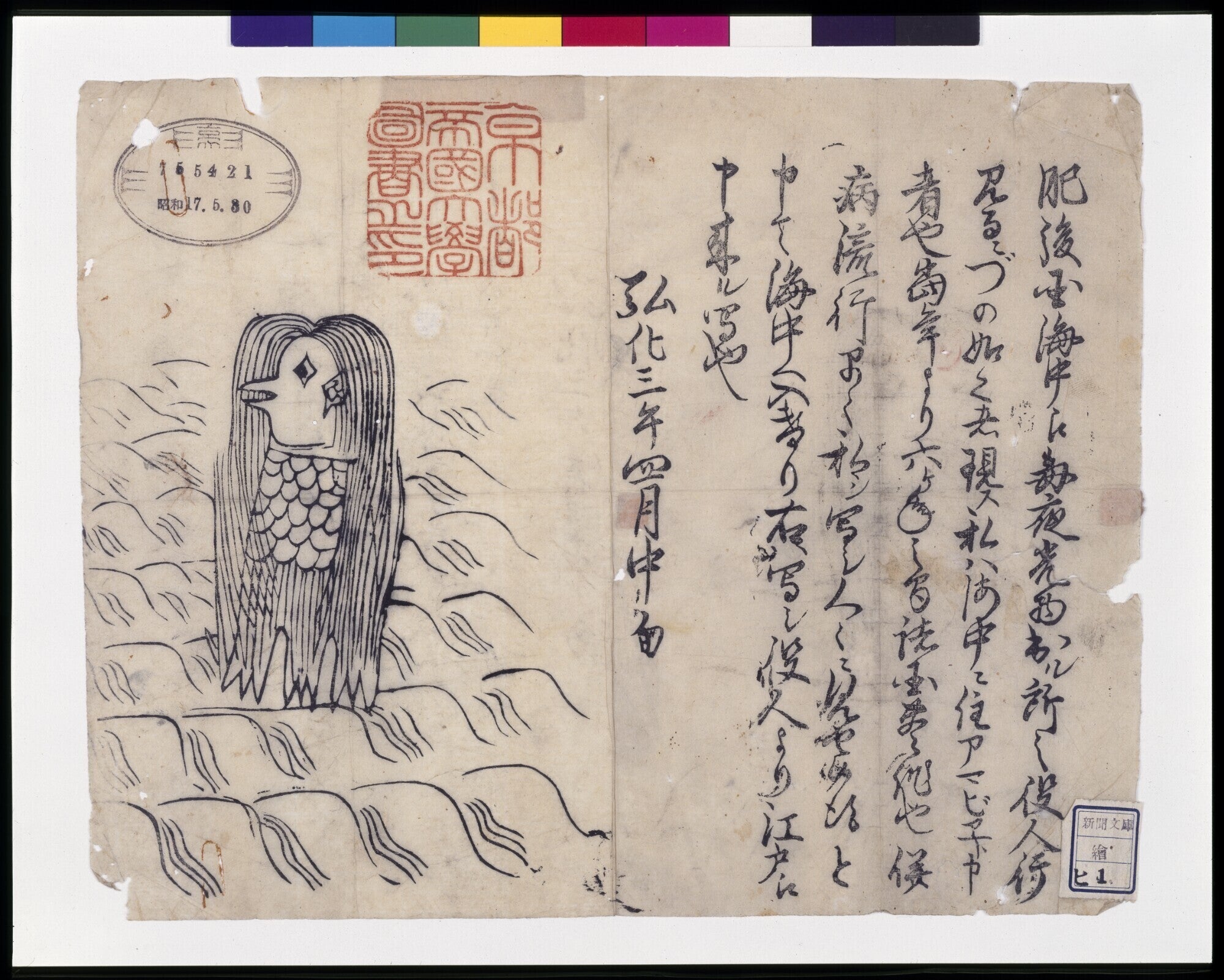 アマビエは、弘化3(1846)年に肥後国(今の熊本県)の海に現れたとされる妖怪。京都大学の付属図書館が所蔵している摺物(すりもの:新聞と魔よけの札を兼ねたような印刷物)には、『今年から6年間は豊作が続くけれども、そのかわりに疫病がはやる。そこで、自分の姿を絵に描いてそれを見せるように』といって消えた、と書かれています。この資料などから、疫病除けの妖怪と言われるようになりました。※『肥後国海中の怪(アマビエの図)』(京都大学附属図書館所蔵)