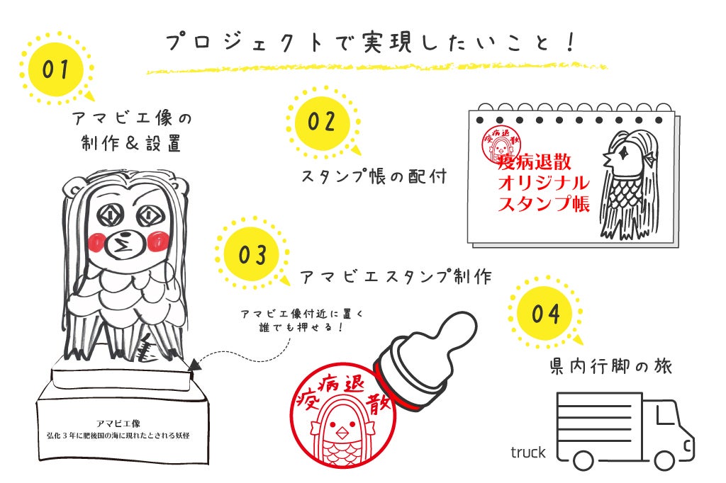 皆様から応援いただいた支援金は、オリジナルアマビエの立体像、台座、募金箱、アマビエスタンプ、スタンプ台紙、県内を周遊する際の輸送費に充てさせていただきます。