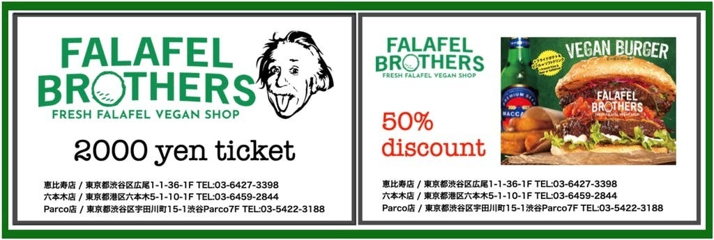 FALAFEL BROTHERS 2,000yen ticket. 2,000 yen x 1 + Burger 50% discount ticket x 1