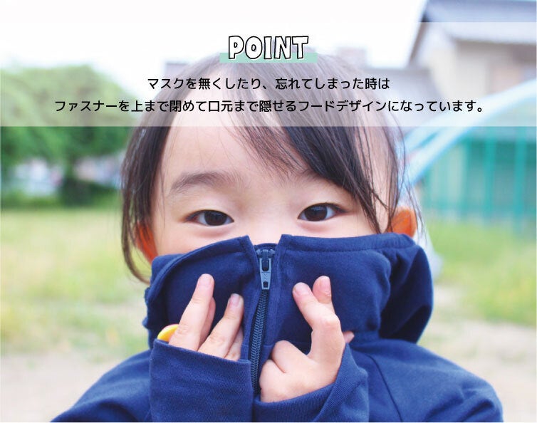 またマスクを失くしたり、忘れてしまった時はファスナーを上まで閉めて口元まで隠せるフードデザインになっています。