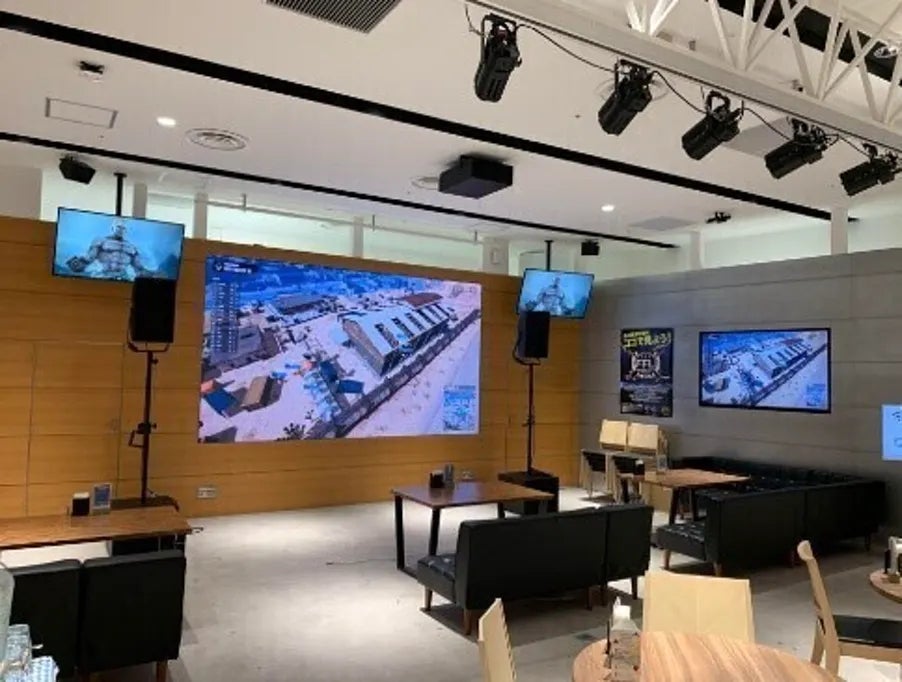 日本初の大型eスポーツパブリックビューイングカフェの当店は、高い天井高の広々としたスペース、160インチの大型モニター、大小モニター6基、高性能スピーカーを設置してeスポーツの楽しさとダイナミックさを余すことなく体感!