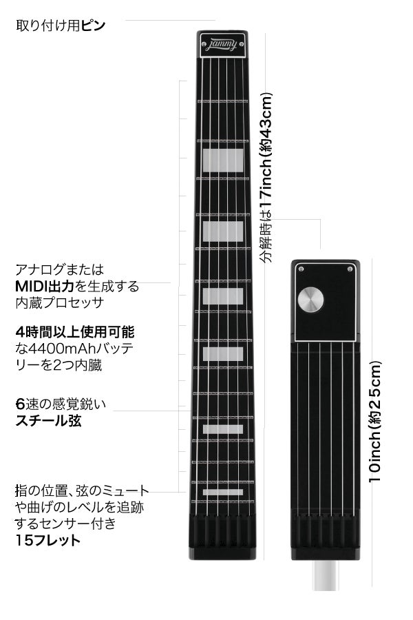 Jammy –オンボードサウンドのバックパックサイズのMIDIギターです。 ジャミーは本物のスチール弦で15フレットを搭載。 ユニークなモジュール構造と取り外し可能なネックにより、持ち運びに便利です。