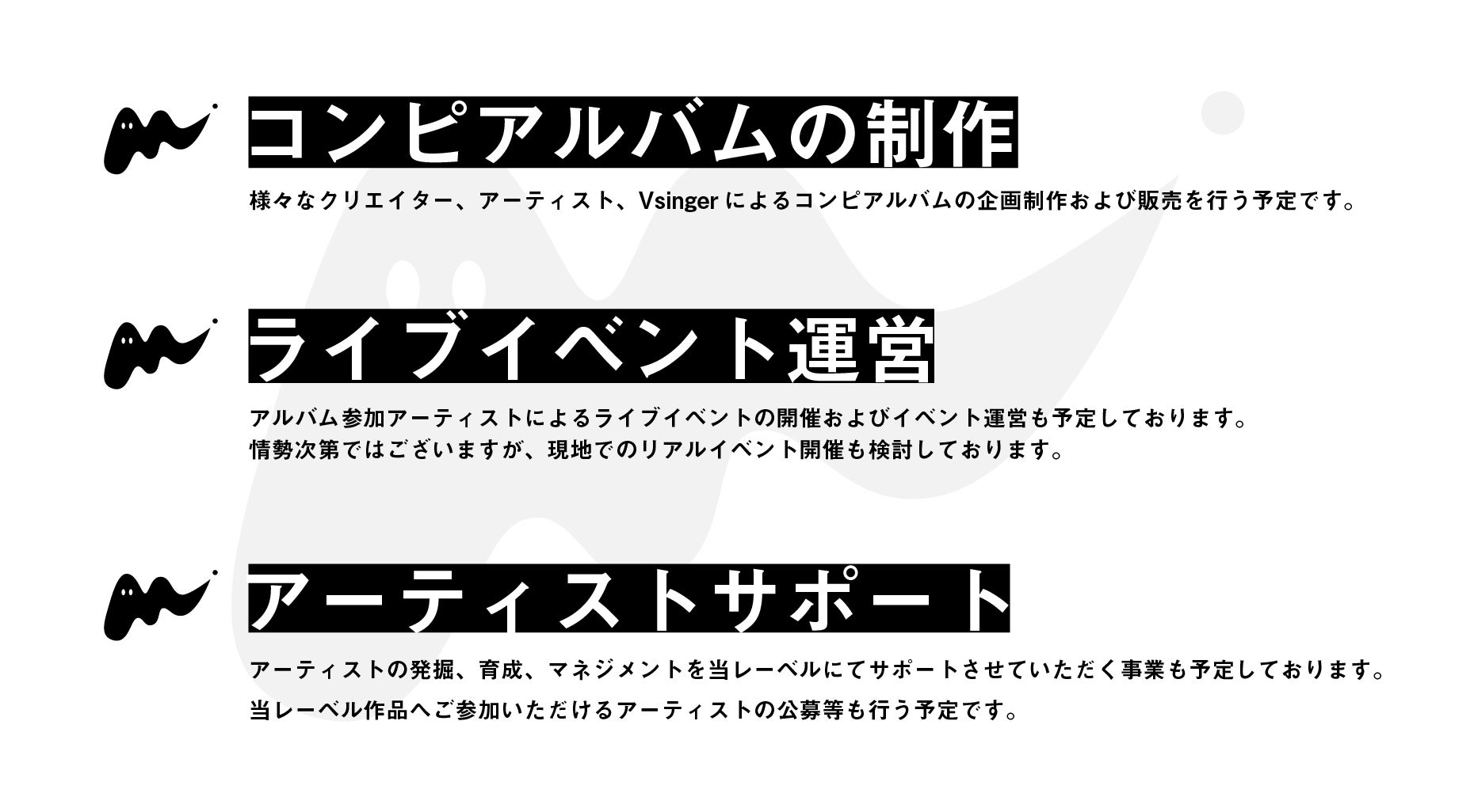 アーティストの発掘、育成、マネジメントを当レーベルにてサポートさせていただく事業も予定しております。当レーベル作品へご参加いただけるアーティストの公募等も行う予定です。