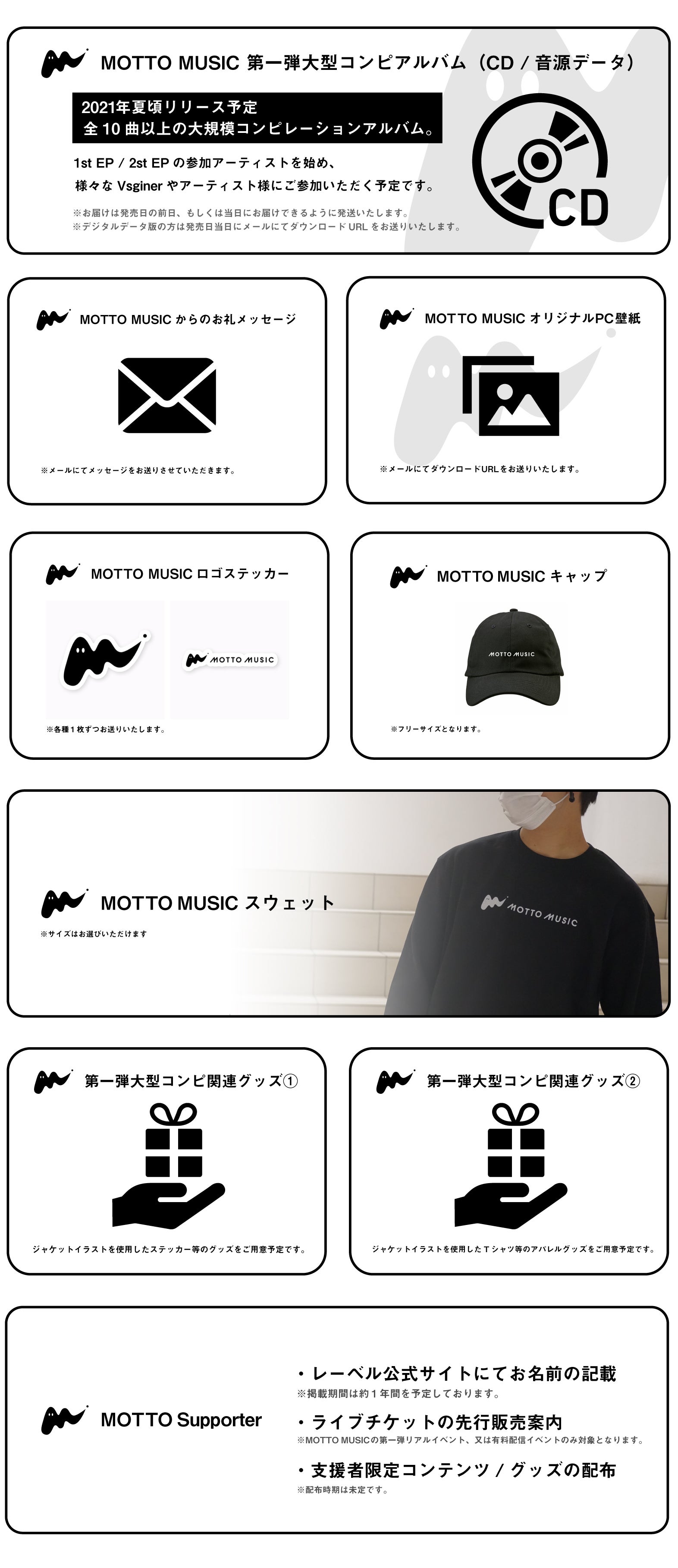 第一弾大型コンピアルバム関連グッズをお送りいたします。ジャケットイラストを使用したTシャツ、パーカー等のアパレルグッズをお届け予定です。(内容変更となる可能性がございます)