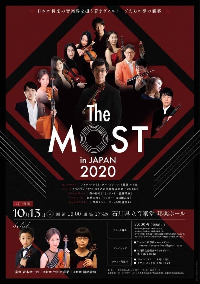 初となる2020年日本ツアーでは国内外で幅広く活躍する12名の若手音楽家がThe MOSTのメンバーとして集結します。 演奏者のゆかりのある地方を巡り、地域貢献の一環として各地方の10代以下の若きヴァイオリニストをソリストとして招き、J.S.バッハ 2つのヴァイオリンのための協奏曲 BWM1043をThe MOST と共演して頂きます。 彼らの出演をきっかけに初めてクラシック音楽に触れて頂くことも期待し、クラシック音楽に接点がなかった方々にクラシックの楽しさ、音楽の魅力を実感して頂き、また足を運びたいと感じられる演奏会にしたいと思っております。 東京・広島・岡山・京都・石川の 5 公演のツアーを予定しておりましたが、 新型コロナウイルスの影響により東京・岡山・石川の 3 公演のツアーに縮小となりました。