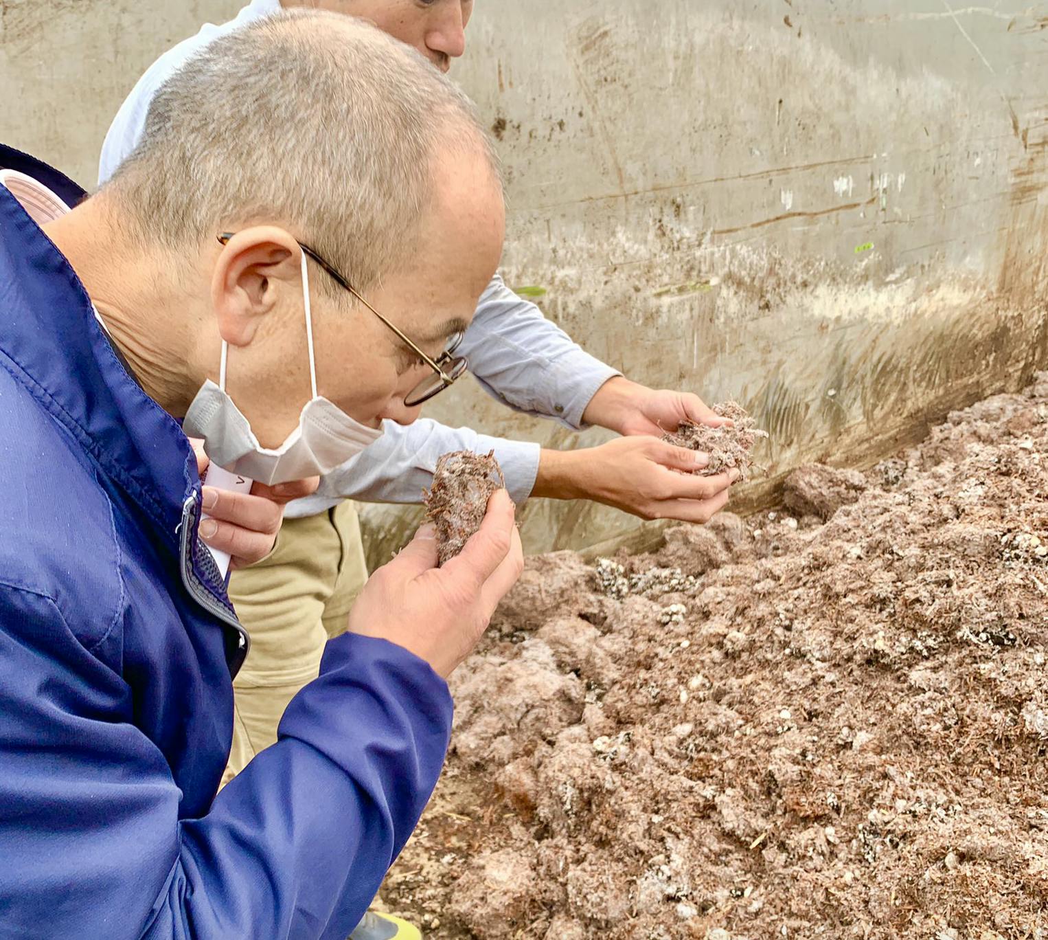 引退馬の馬糞堆肥の利活用を視察する角居師