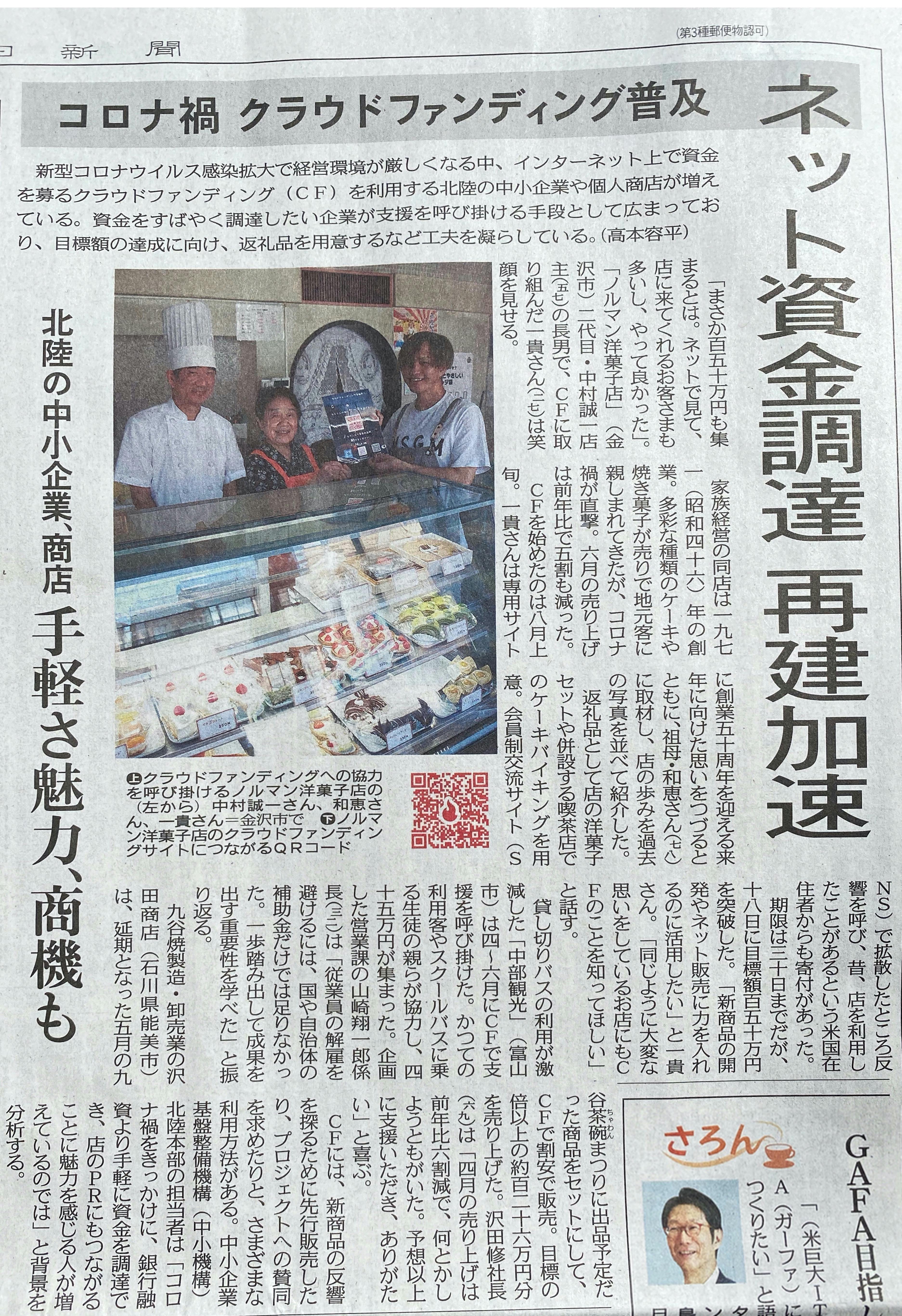2020/08/23 16:00本日もたくさんのご来店、ご支援頂き誠にありがとうございます。写真ですが、8/21の北陸中日新聞様の朝刊に掲載となりました。また、本日8/23の北陸中日新聞様の朝刊では、おばあちゃんのコラムが掲載となりました。たくさんのお客様から、「新聞見たよ〜」という声が多く、やっぱり新聞ってすごいなと改めて感じました。このように報道のお力で、コロナで経営逼迫しているところが少しでも助かるようになれば、日本の経済も立て直していけるのかな、と思ったり。現状ですが、「332名」のご支援者様よりご支援いただいております。ご協力くださった方々に感謝申し上げます。ネクストゴールに向け、ご支援者様目標「400名様」を目指して、まだまだ挑戦中ですので、引き続きどうぞよろしくお願いいたします。ノルマンはコロナに負けず、元気に営業してまいりますので、これからも皆さまにケーキを楽しんで頂けるように精一杯頑張ってまいりますので、何卒よろしくお願いいたします。家族一同全力で、皆さまに愛さているノルマンを守って、変わらぬ味をご提供していきます。ご協力くださったかたすべての方に、ご多幸がありますように... もっと見る