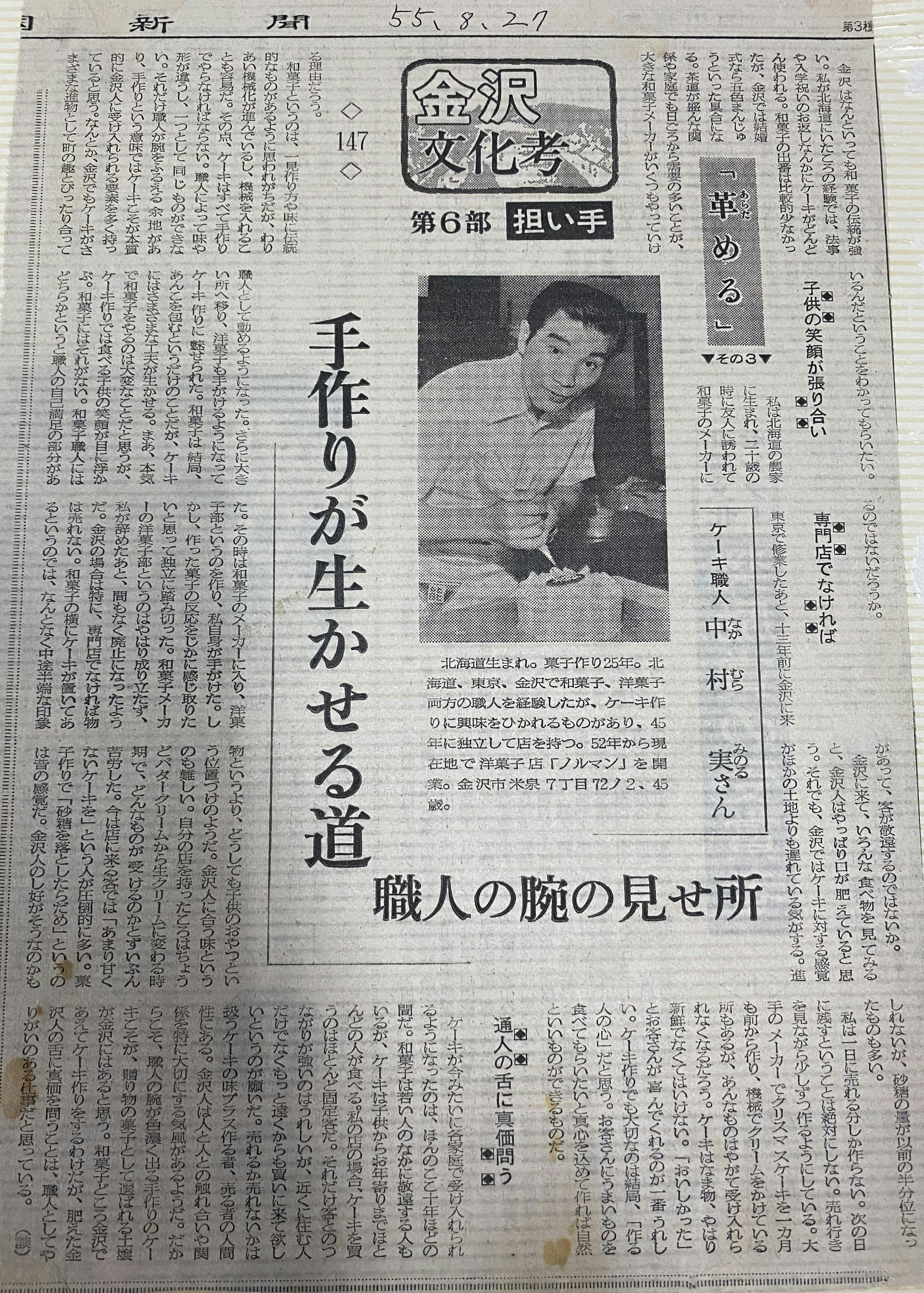 2020/08/30 15:30本日もたくさんのご来店、ご支援ありがとうございます。クラウドファンディングを通して、たくさんのご支援者様からコメントや、お声をいただく機会が増えました。また、ご取材を受けることも増え、昔のことを度々聞かれることが多くなりました。そのため、過去を知るため、祖母の家のタンスの奥から、アルバムを引っ張り出し、様々なストーリーを聞くことができました。そしてなにより、創業を決意した祖父の思いが綴ってあった記事を見つけることができましたので、今回は皆さまにシェアしたいと思い、本文を載せさせて頂きます。ちょうど今から40年前の8月27日の記事となります。北國新聞社さま昭和55年(1980年)8月27日 金沢 文化考 記事ーーーーー第6部 担い手手作りが生かせる道職人の腕の見せ所金沢はなんといっても和菓子の伝統が強い。私が北海道にいた頃の経験では、法事や入学祝いのお返しなんかにケーキがどんどん使われる。和菓子の出番は比較的少なかったが、金沢では結婚式なら五色まんじゅうといった具合になる。茶道が盛んな関係や家庭でも日頃からの需要が多いことが、大きな和菓子メーカーがいくつもやっていける理由だろう。和菓子というのは、一見作り方や味に伝統的なものがあるように思われがちだが、わりあい機械化が進んでいるし、機械を入れることも容易だ。その点、ケーキはすべて手作りでやらなければならない。職人によって味や形が違うし、一つとして同じものができない。それだけ職人が腕をふるえる余地があり、手作りという意味ではケーキこそが本質的に金沢人に受け入れられる要素を多く持っていると思う。なんとか、金沢でもケーキがさまざまな進物として街の趣とぴったり合っているんだということをわかってもらいたい。子供の笑顔が張り合い私は北海道の農家に生まれ、二十歳のときに友人に誘われて和菓子のメーカーに職人として務めるようになった。さらに大きいところへ移り、洋菓子も手がけるようになって、ケーキ作りに魅せられた。和菓子は結局、あんこを包むというだけのことだが、ケーキにはさまざまな工夫が生かせる。まあ、本気で和菓子をやるのは大変なことだと思うが、ケーキ作りでは食べる子供の笑顔が目に浮かぶ。和菓子にはそれがない。和菓子職人にはどちらかというと職人の自己満足の部分があるのではないだろうか。専門店でなければ東京で修行したあと、十三年前に金沢に来た。その時は和菓子のメーカーに入り、洋菓子部というのを作り、私自身が手掛けた。しかし、つくった歌詞の反応をじかに感じ取りたいと思って独立に踏み切った。和菓子メーカーの洋菓子部というのはやはり成り立たず、私が辞めたあと、まもなく廃止になったようだ。金沢の場合は特に、専門店でなければ物は売れない。和菓子の横にケーキが置いてあるというのでは、なんとなく中途半端な印象があって、客が敬遠するのではないか。金沢に来て、いろんな食べ物を見てみると、金沢人はやっぱり口が肥えていると思う。それでも、金沢ではケーキに対する感覚がほかの土地よりも遅れている気がする。進物というより、どうしても子供のおやつという位置づけのようだ。金沢人に合う味というのも難しい。自分の店を持ったことはちょうどバタークリームから生クリームに変わる時期で、どんなものが受けるのかとずいぶん苦労した。今は店に来る客では、「あまり甘くないケーキを」という人が圧倒的に多い。菓子作りで「砂糖を落としたらだめ」というのは昔の感覚だ。金沢人の嗜好がそうなのかもしれないが、砂糖の量が以前の半分くらいになったものも多い。私は一日に売れる分しか作らない。次の日に残すということは絶対にしない。売れ行きを見ながら少しずつ作るようにしている。大手のメーカーでクリスマスケーキを一ヶ月も前から作り、機械でクリームをかけている所もあるが、あんなものはやがて受け入れられなくなるだろう。ケーキは生物、やはり新鮮でなくてはいけない。「おいしかった」とお客さんが喜んでくれるのが一番うれしい。ケーキ作りでも大切なのは結局、「作る人の心」だと思う。お客さんにうまいものを食べてもらいたいと真心を込めて作れば、自然といいものができるものだ。通人の下に真価問うケーキが今みたいに各家庭で受け入れられるようになったのは、ほんのここ十年ほどの間だ。和菓子は若い人のなかに、敬遠する人もいるが、ケーキは子供からお年寄りまでほとんどの人が食べる。私の店の場合、ケーキを買うのはほとんど固定客だ。それだけ客とのつながりが強いのはうれしいが、近くに住む人だけでなくもっと遠くからも買いに来て欲しいというのが願いだ。売れるか売れないかは扱うケーキの味プラス作る者、売る者の人間性にある。金沢人は人と人との触れ合いや関係を特に大切にする気風があるようだ。だからこそ、職人の腕が色濃く出る手作りのケーキこそ