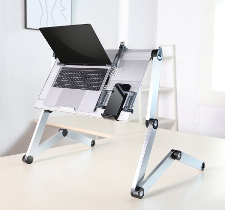 従来のパソコンデスクは、3本アーム式で安定性に欠け、クリップで挟めるパソコンやタブレットサイズにも制限がありましたが、4本アームの「X5Pro」なら安定性抜群!スライド式の上下4つのクリップで、小さなスマートフォンから18インチの大きなノートPCまで固定することが可能です。
