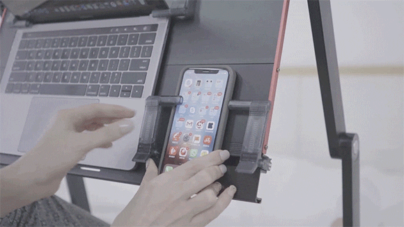 ④可動式の4つのクリップで、スマホからノートPCまでしっかり固定。