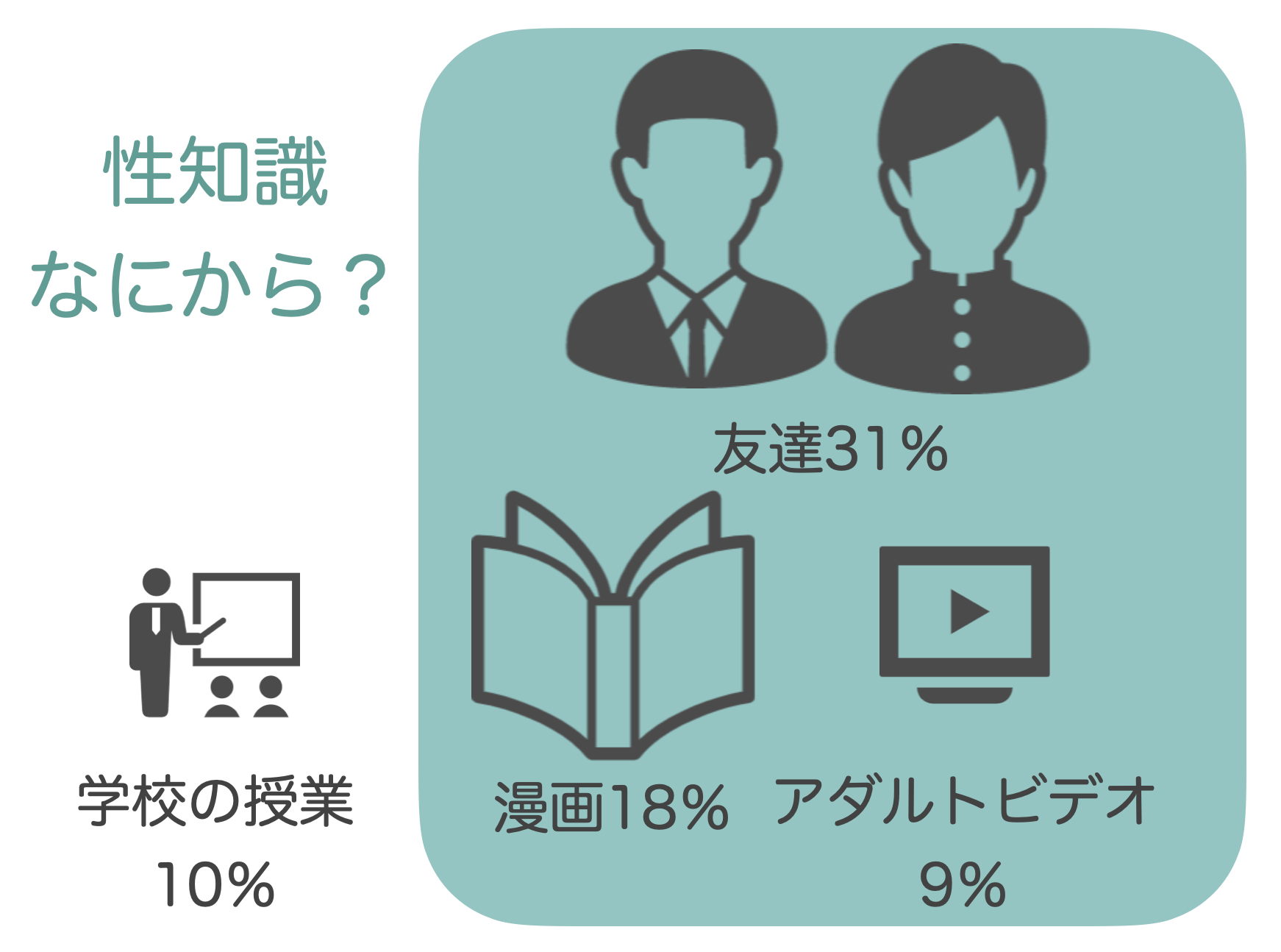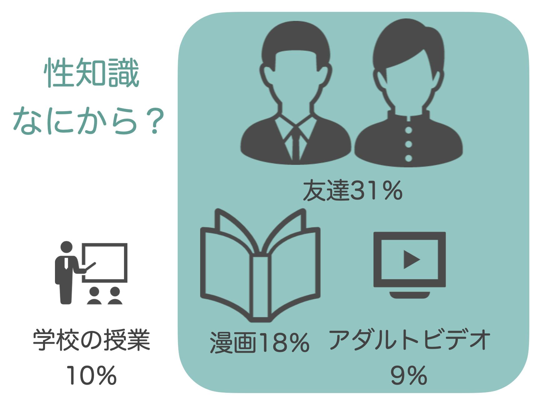 その結果、性知識の情報源として「学校の性教育」と回答した人はたったの10%、そしてそれ以外の回答は、友だち(31%)漫画(18%)雑誌(10%)アダルトサイト(9%)という調査もあります。(2018年NPO法人ピルコン)
