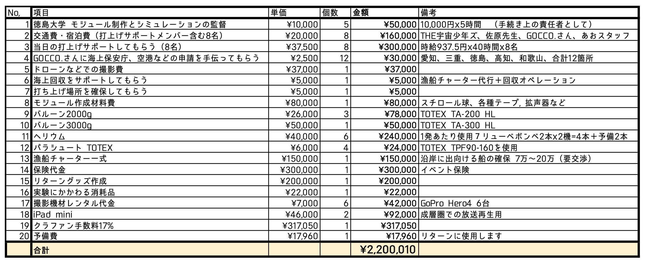 そして、お金が集まった場合でもリスクはあります。たまにプロでも予測不能な事態で失敗することがあるそうです。そのために1回の打ち上げでスペースバルーンを2機飛ばすし、シュミレーションや耐久実験とかもたくさんしますが、100%動画を回収できるとは言い切れないです。その場合もお金を返すことはできません。申し訳ありません。