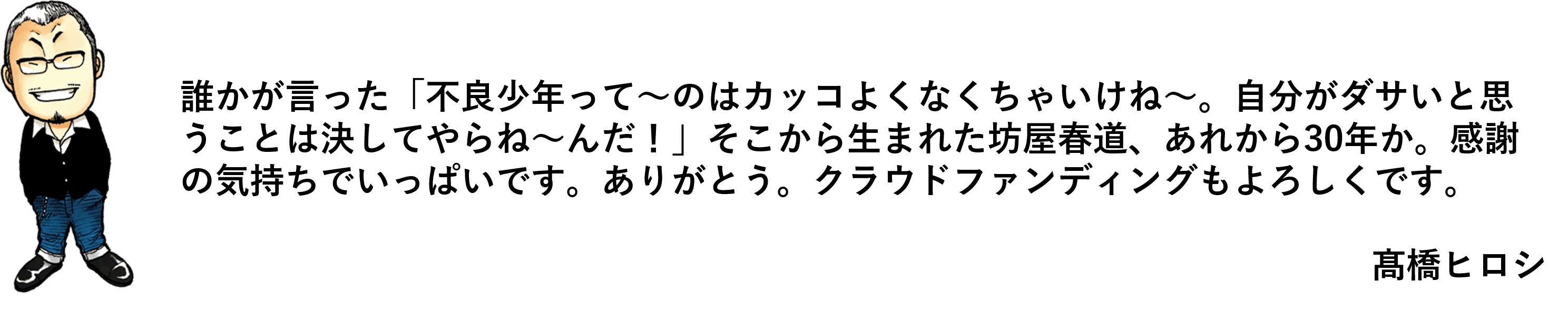 髙橋ヒロシ先生がこのプロジェクトのために描き起こした「春道イラスト」と共に、ご支援へのお礼のメッセージを送らせていただきます。