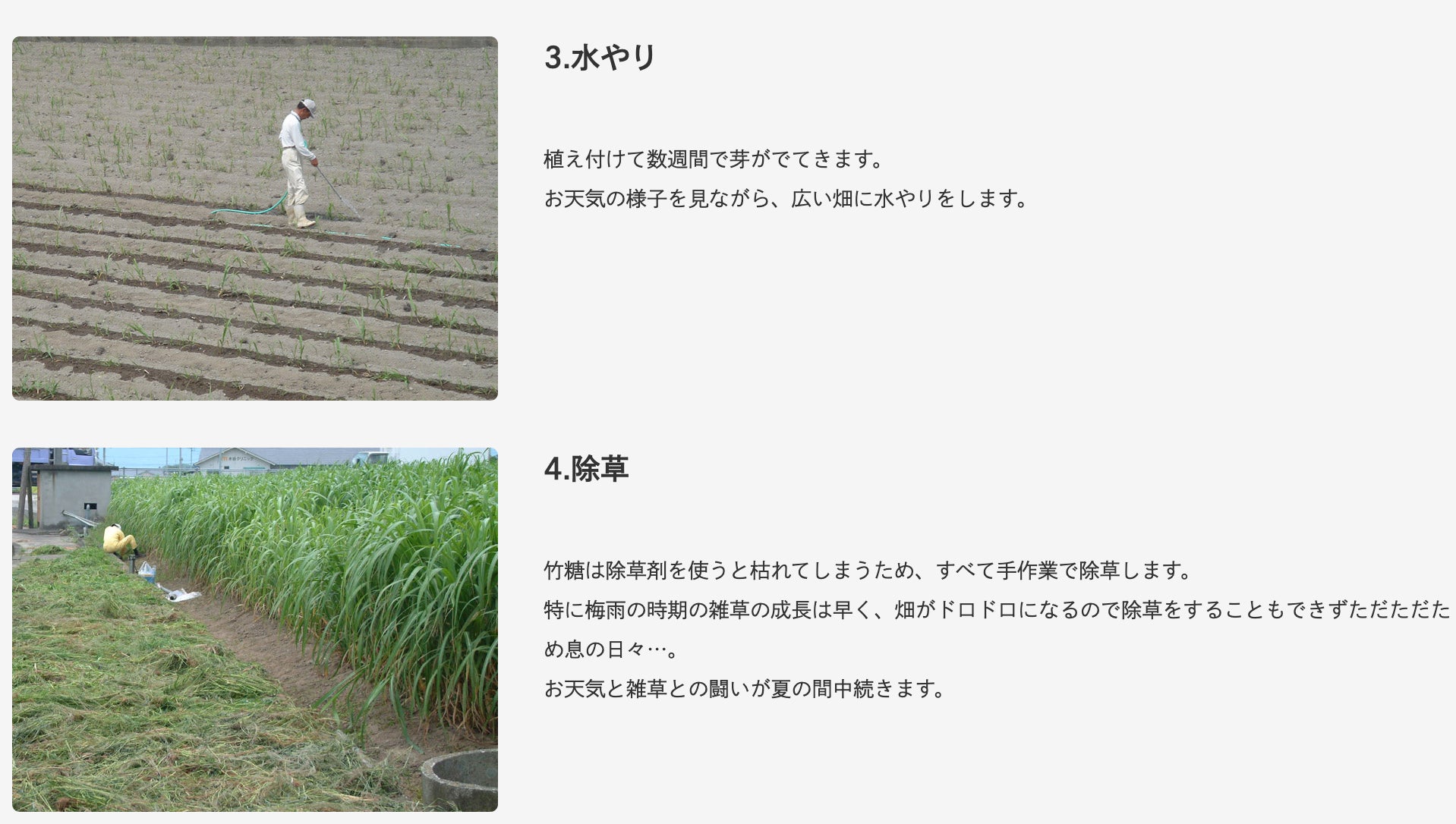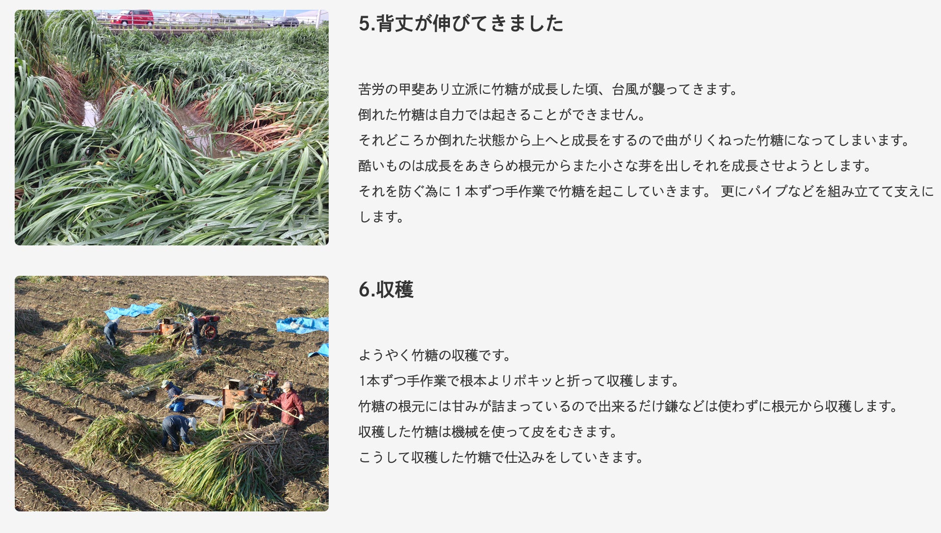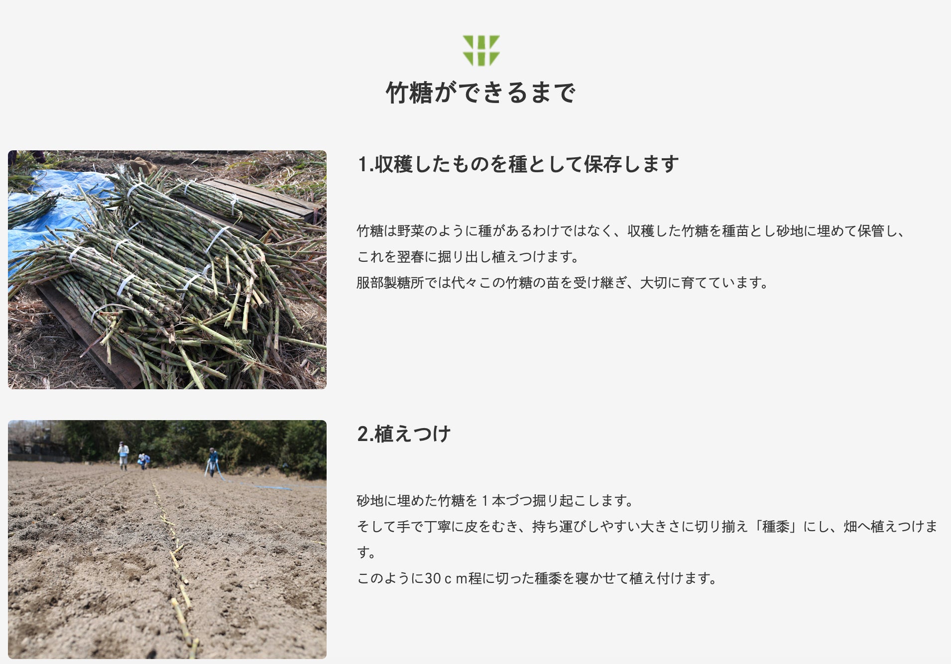 「竹糖」という非常に細いサトウキビ糖の品種で栽培されています。