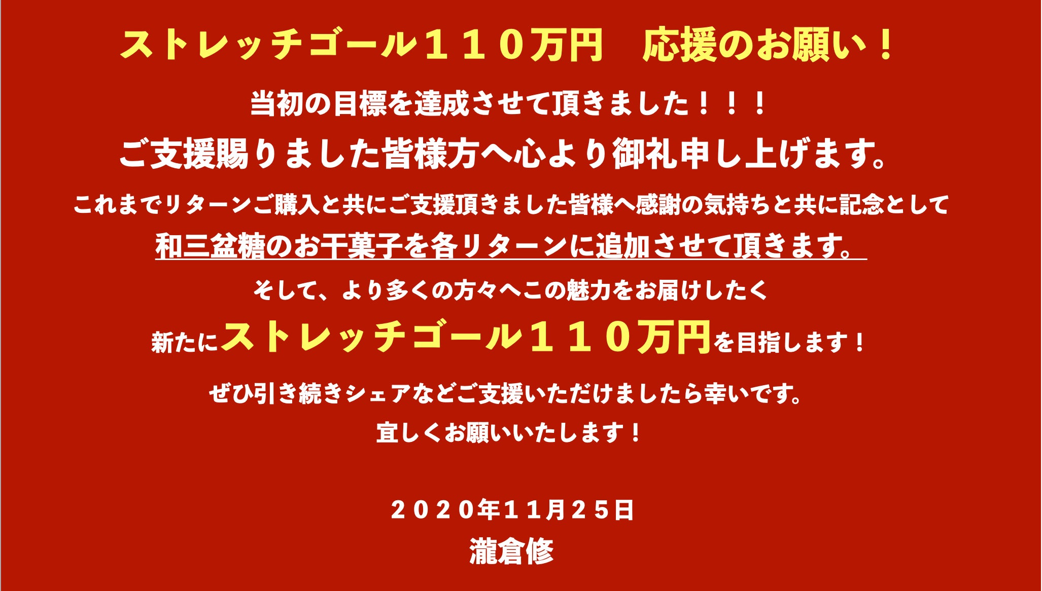 2020/12/07 19:32こんばんは!和三盆クラウドファウンディング現時点まで、100名を越える方々にご支援いただいております。本当にありがとうございます。このプロジェクトを通じて、様々なことを感じてまいりました。当初の目標達成させていただき沢山の方々に和三盆糖のリターン商品をお届けできることをとても楽しみに嬉しく思っております。いよいよ、残り3日間となりました。最後まで、より多くの方々にぜひ和三盆糖の魅力を知っていただくきっかけになればと思います。ストレッチゴールを達成した際には「和ちょこ」をプレゼントさせていただきます!ぜひ、最後の最後の期間になりますが応援のほど宜しくお願いいたします! もっと見る
