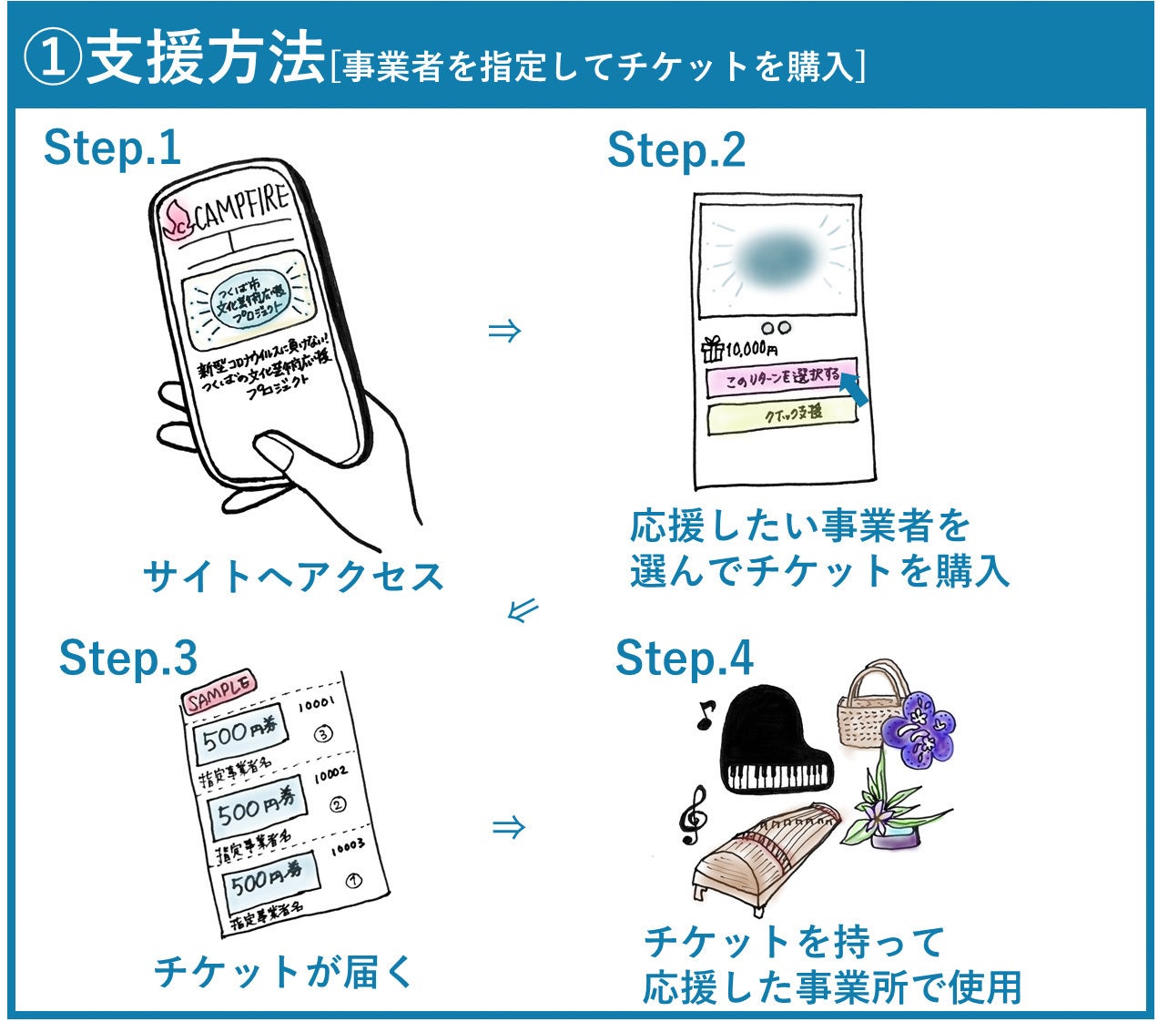 ●支援者が指定する文化芸術関連サービス事業者の「チケット」を購入いただき、後日送付されるチケットを文化芸術関連サービス事業者にてご利用いただけます。
