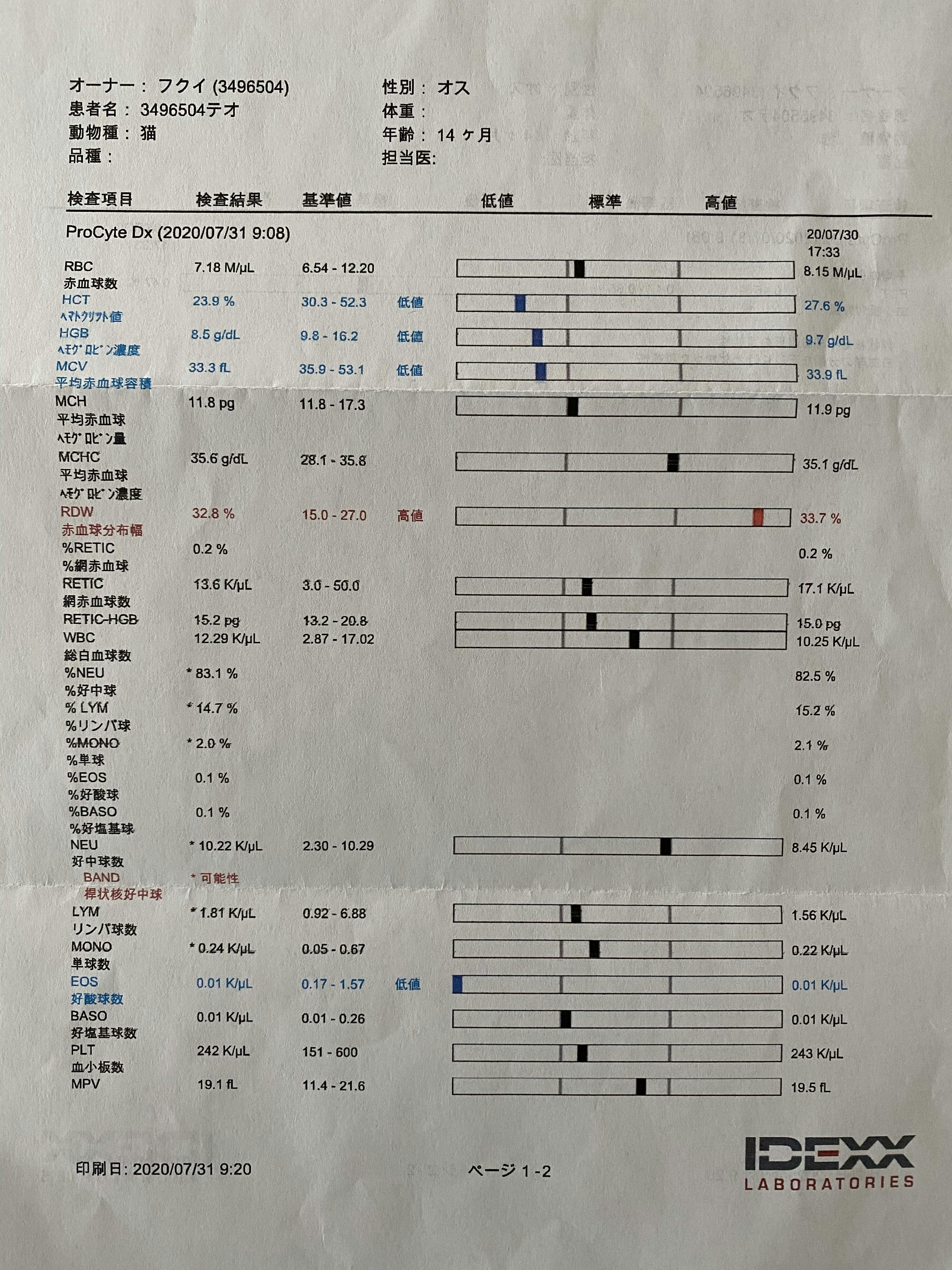2020/11/22 12:38本日定期検診を受けに動物病院に行きました。結果は◎、AG比の数値も良くなって今の所順調です。次回は2ヶ月後になりました。ただ一点気になる数値があります。BUN(尿素窒素)が高めです。腎疾患などが気になるので、後日尿検査予定です。あと、便秘はチューブのサプリとカリカリを変えて様子を見ます。また、ご報告します。ありがとうございました。 もっと見る